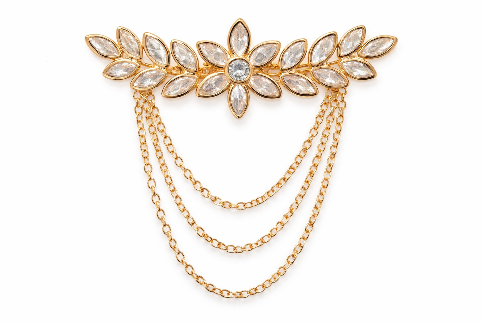 Add a touch of timeless elegance to any outfit with this stunning floral chain brooch. Crafted in a rich gold-tone finish, the brooch features a beautifully detailed flower motif highlighted with sparkling marquise-cut stones and a brilliant round centerpiece. Delicate layered chains cascade gracefully from both sides, creating a luxurious and eye-catching drape.