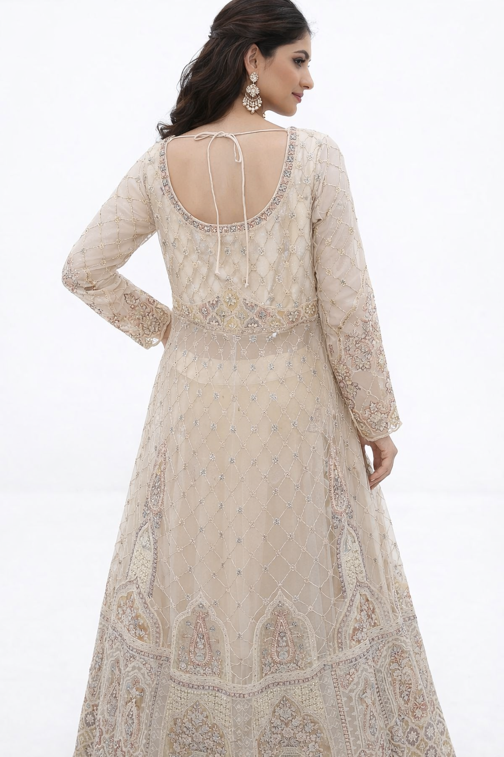 Step into timeless elegance with this beautifully crafted beige Anarkali suit, designed for weddings, receptions, and festive occasions. The outfit features intricate pastel floral embroidery with delicate threadwork and subtle sequin detailing, creating a soft yet luxurious look.The Anarkali kurta showcases a flattering V-neckline in the front and a graceful scoop back with tie-up dori detailing, adding a touch of charm and sophistication. The fitted bodice flows into a full flared silhouette, highlighted by ornate embroidered panels and an intricately detailed hemline that enhances movement and elegance.Sheer net sleeves with fine embroidered motifs add a refined finish, while the matching lightweight net dupatta with embroidered borders completes the ensemble beautifully.
