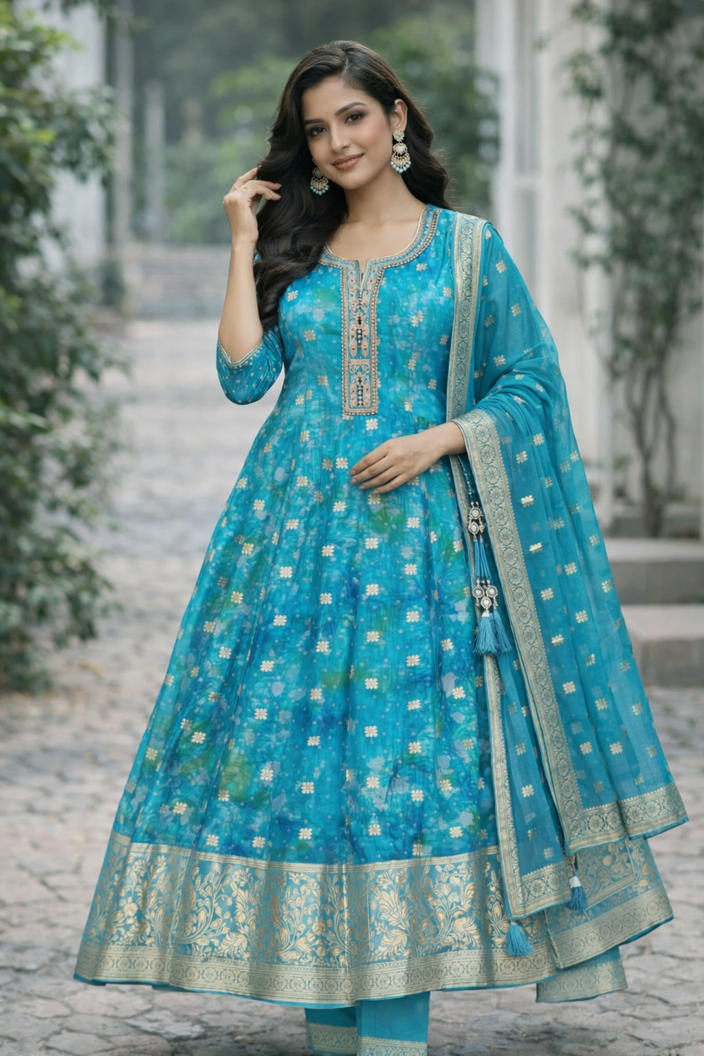 Bring home timeless elegance with this stunning turquoise blue Anarkali suit set, designed to make a graceful statement at every occasion. The full-length flared Anarkali features delicate all-over gold butti motifs, beautifully complemented by a richly embroidered neckline that adds a touch of regal charm. The soft, flowy fabric creates a flattering silhouette with elegant movement, perfect for festive and celebratory wear.Paired with matching straight pants finished with a coordinated zari border, this ensemble is completed with a sheer turquoise dupatta adorned with intricate gold motifs, an ornate zari border, and elegant tassel detailing for added sophistication.Ideal for weddings, festive celebrations, parties, and special occasions, this Anarkali suit effortlessly blends traditional craftsmanship with contemporary elegance.
