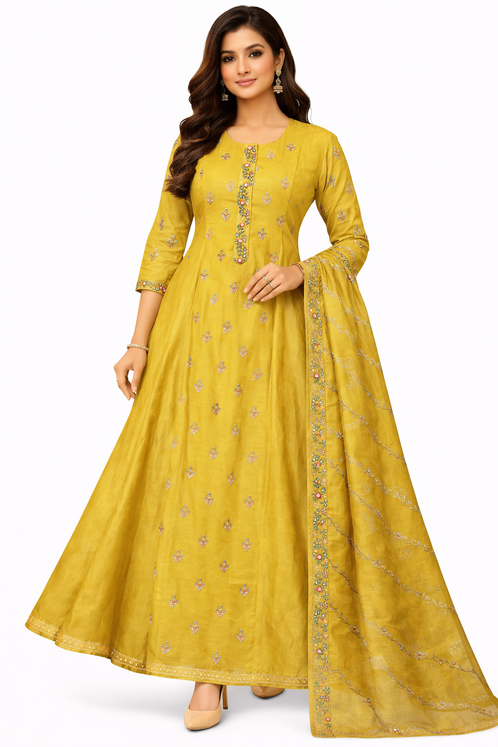 Radiate elegance and festive charm with this Mustard Yellow Embroidered Anarkali Suit, crafted to offer a graceful silhouette with delicate detailing. The Anarkali kurta features a beautifully flared design adorned with subtle all-over embroidery and a richly embellished neckline panel, adding a refined traditional touch.Paired with matching bottoms, the ensemble is completed with a coordinated dupatta highlighted by fine embroidery and elegant border detailing. Perfect for festive celebrations, daytime functions, and special gatherings, this suit blends comfort, colour, and timeless appeal.