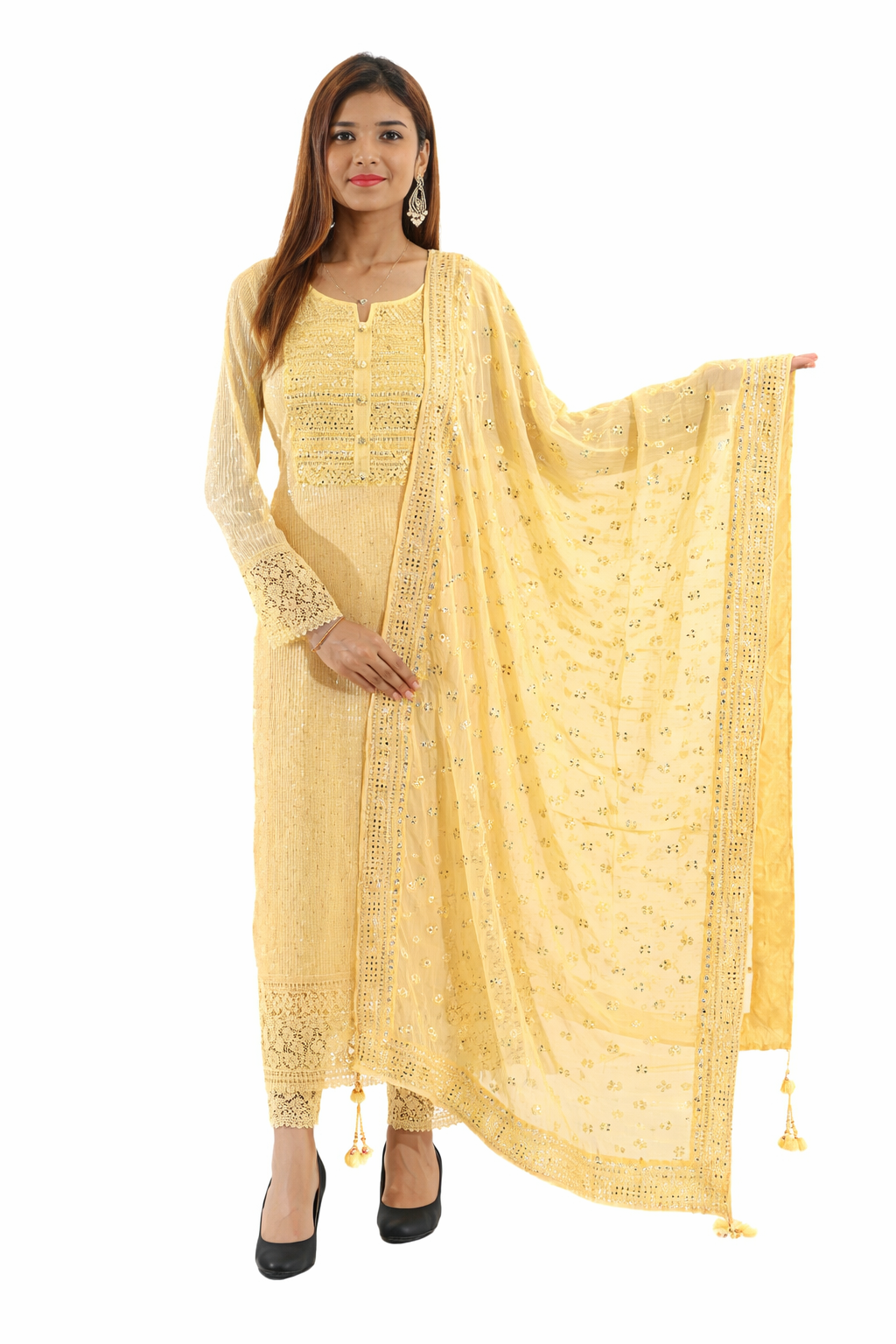 Includes a straight kamiz, a matching dupatta, and pants.Features attached sleeves for a complete and polished look.