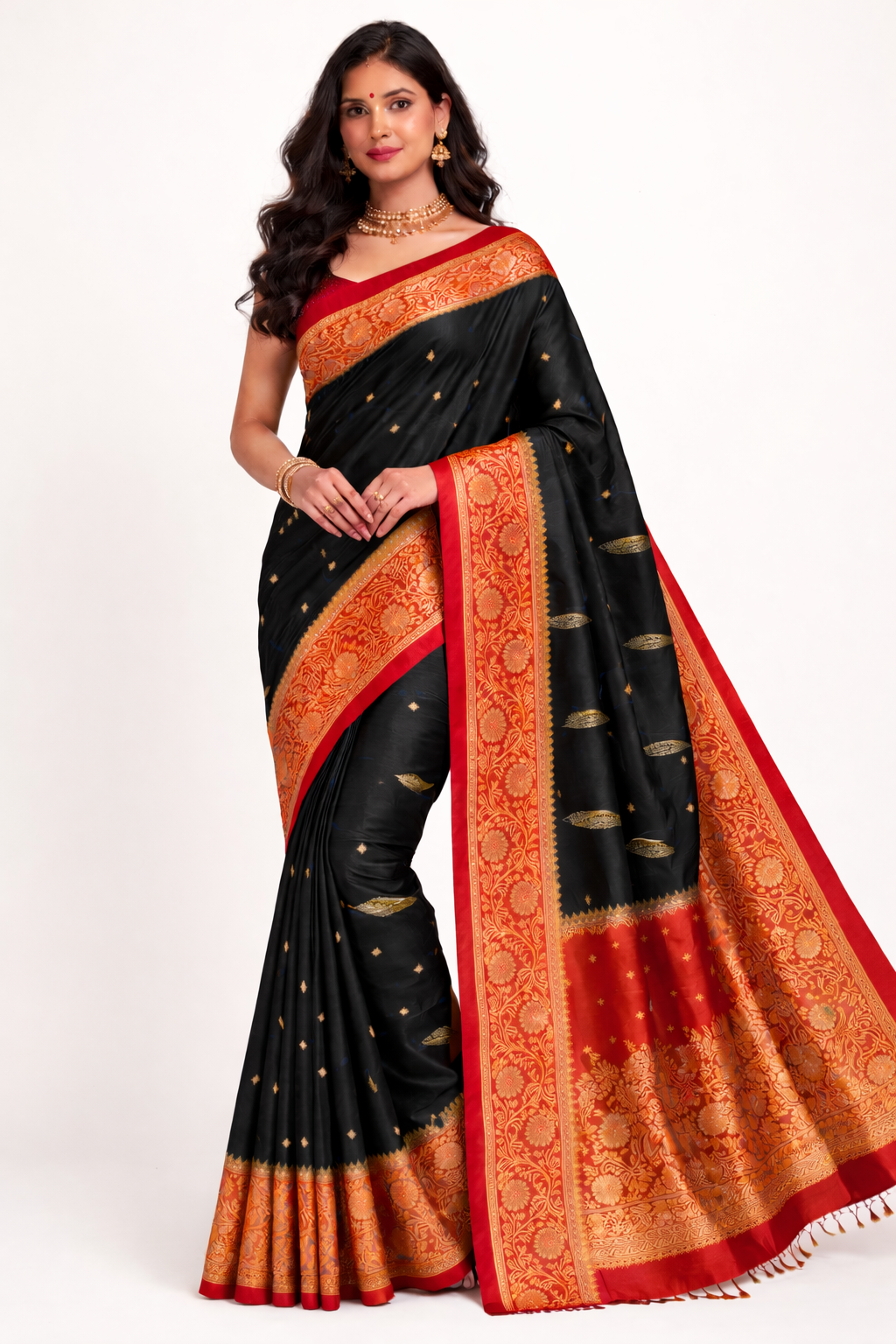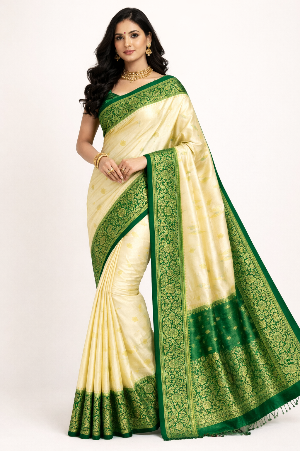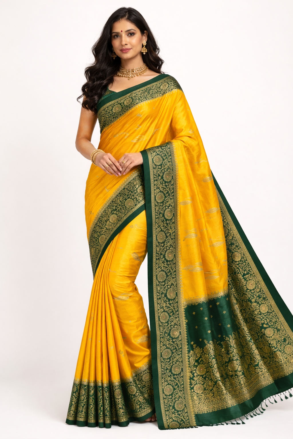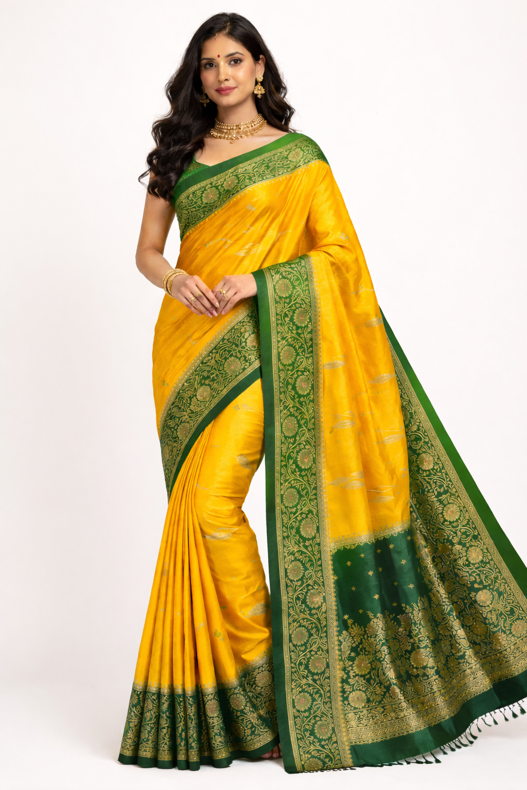 A graceful soft silk saree crafted for timeless elegance.Features a rich hand-dyed contrast pallu and intricately woven zari border.Lightweight, smooth drape, and perfect for weddings, pooja, and festive occasions.