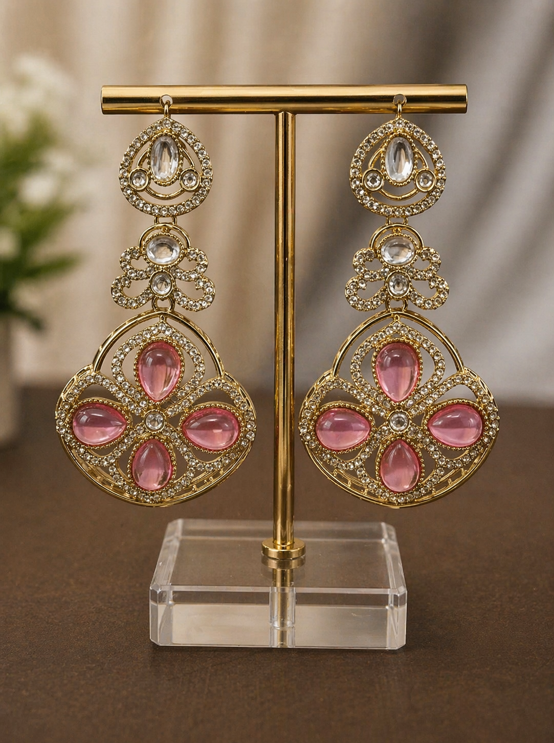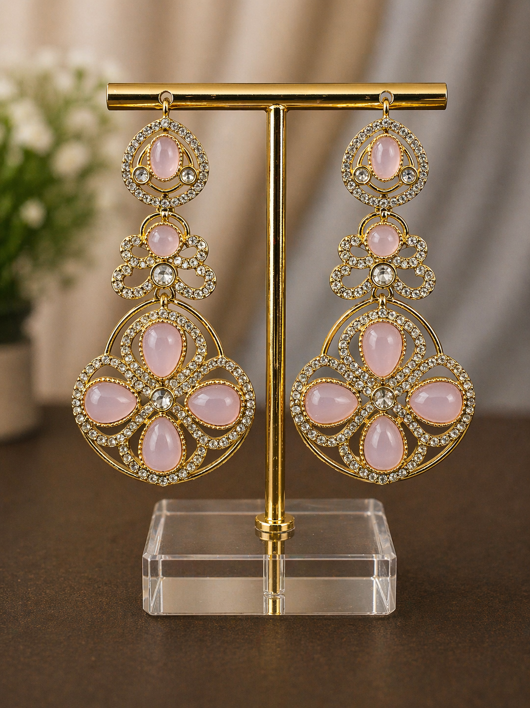 The highlight of the piece is the light pink cabochon stones, arranged in a floral-inspired pattern, giving a graceful and feminine finish. The layered chandelier design creates movement and adds a premium, festive feel—perfect for weddings, parties, and special occasions.