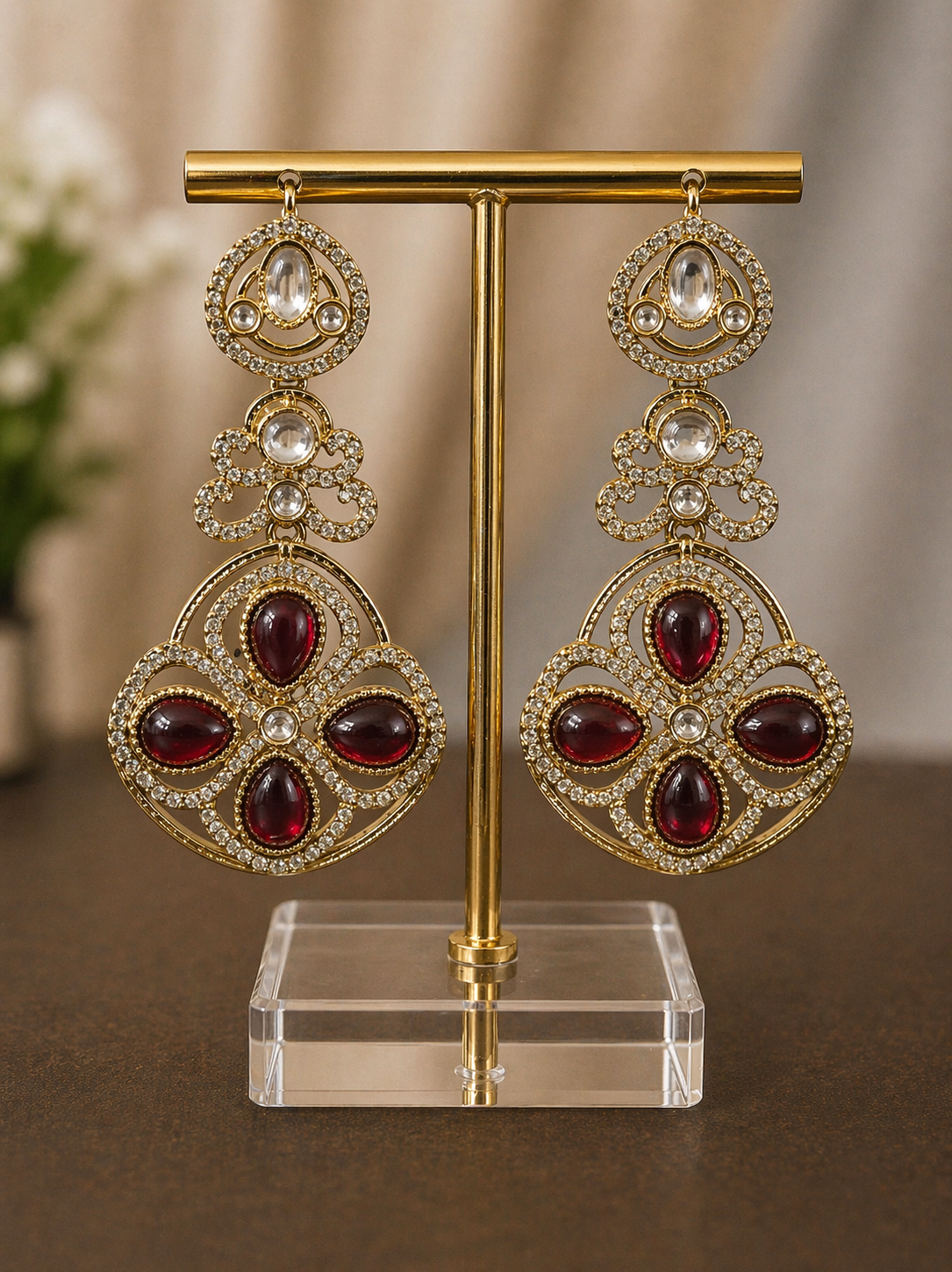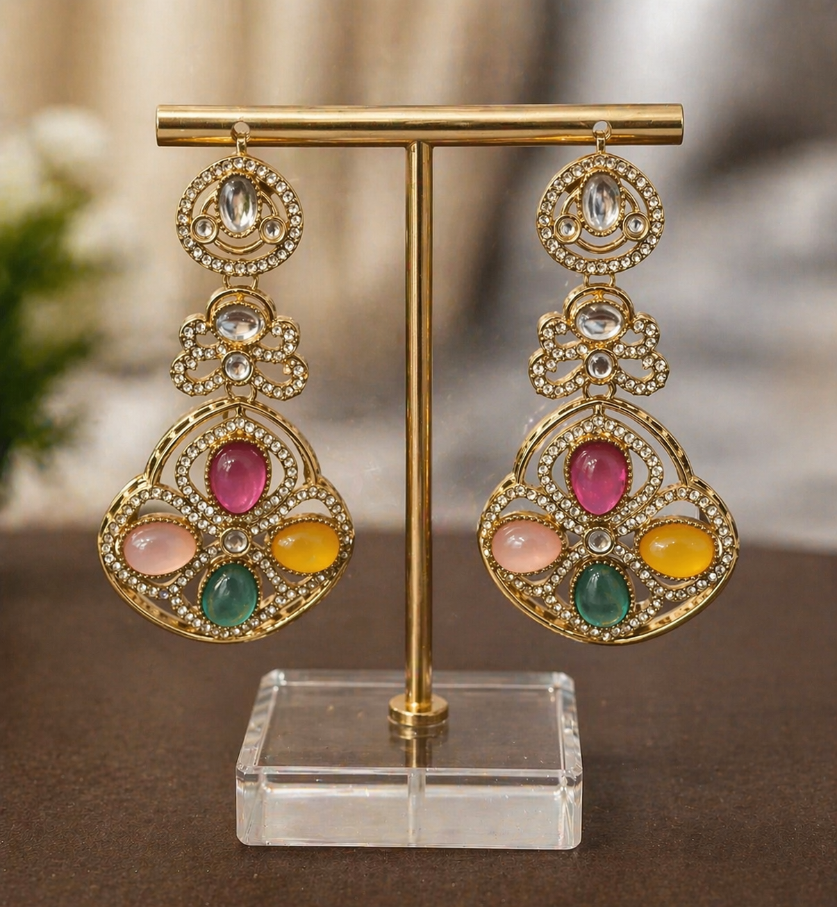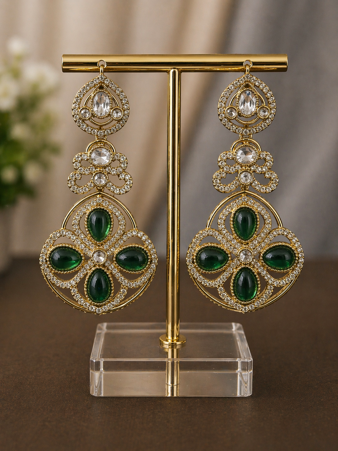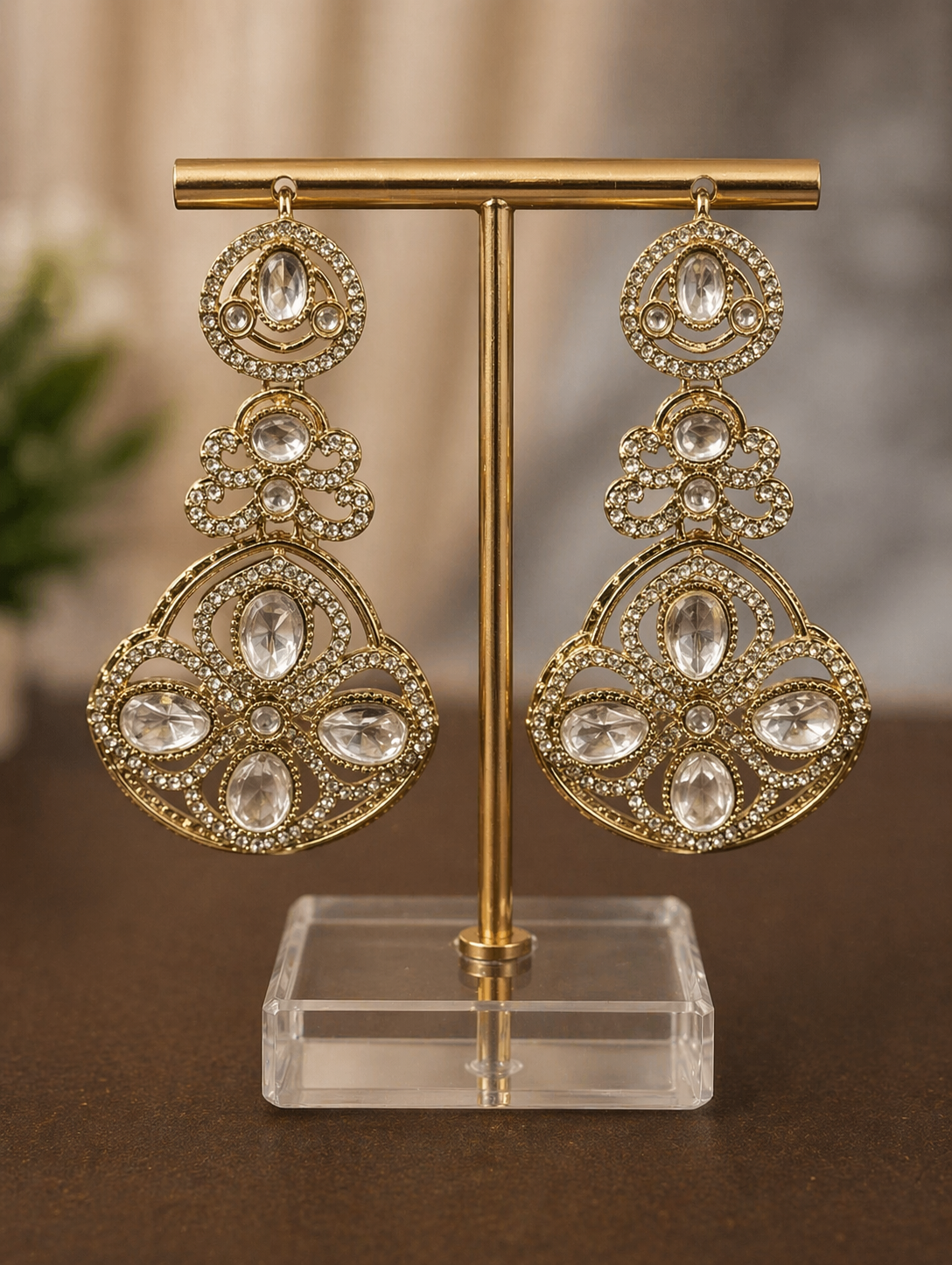 Elegant and eye-catching, these statement earrings are crafted to add a soft touch of luxury to any outfit. Designed with a rich gold-tone base, the intricate detailing is enhanced with sparkling crystal accents that beautifully frame the stones.