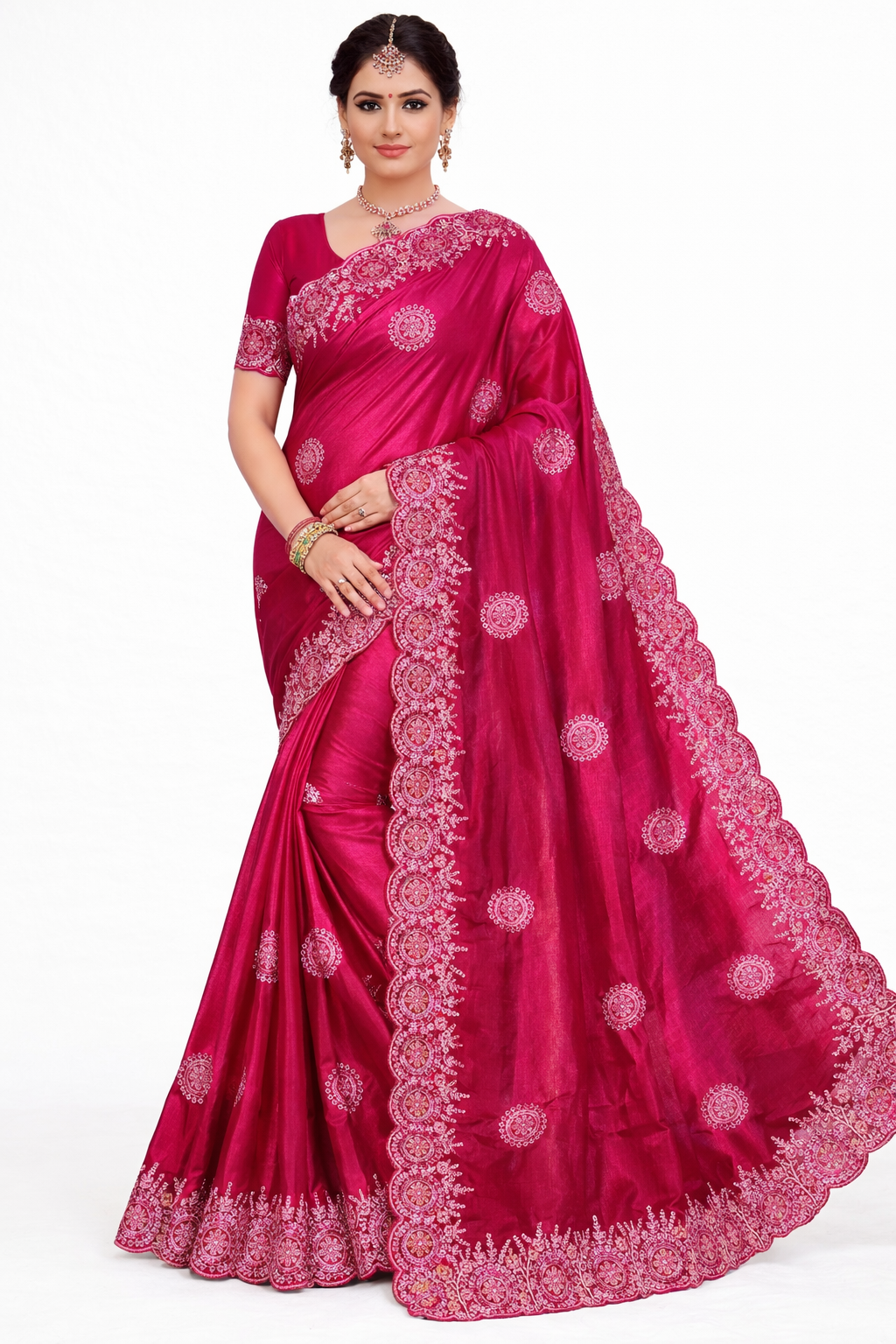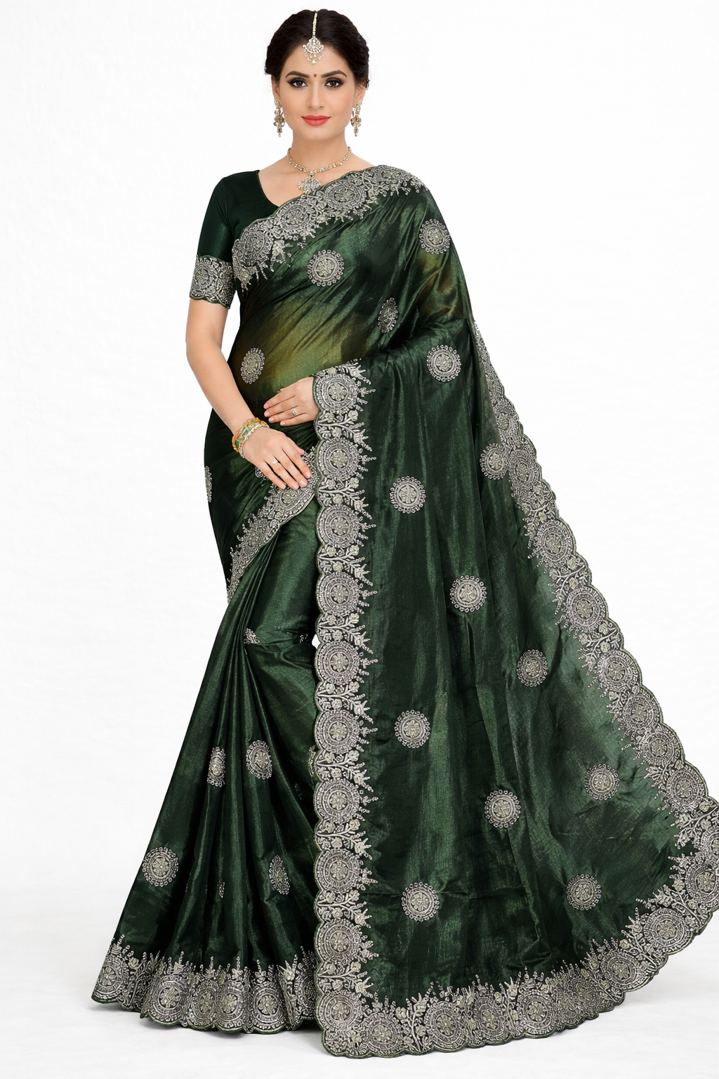 Make a graceful statement with this luxurious Tissu saree, designed for elegance and celebration. Crafted from premium textured fabric with a soft sheen finish, this saree drapes beautifully and enhances the silhouette with a rich, flowing fall.The design features intricate circular embroidered motifs spread across the body, complemented by a heavily detailed scalloped border that adds grandeur and refinement. The pallu carries matching embroidery, creating a complete, balanced festive look.Perfect for weddings, receptions, festive gatherings, and special occasions, this saree pairs beautifully with statement jewelry and bangles for a regal finish.• Premium Tissu fabric with subtle shine• All-over detailed embroidery motifs• Heavy scalloped embroidered border• Rich, elegant pallu design• Ideal for weddings & festive wear• Comfortable yet luxurious drape
