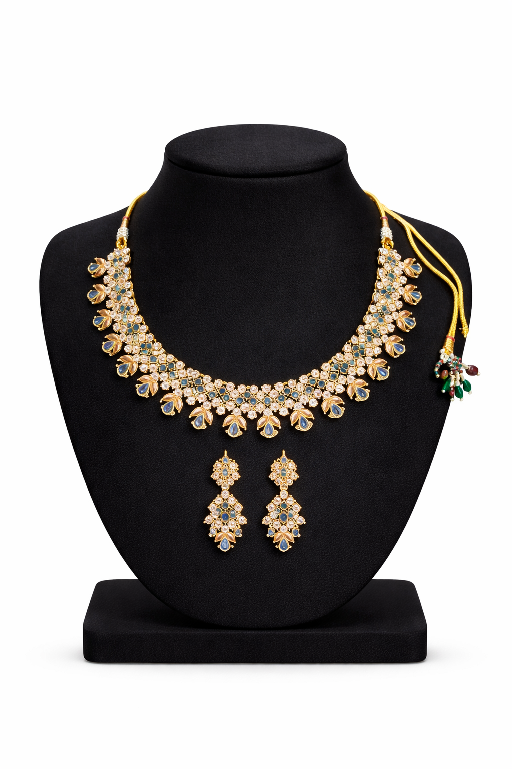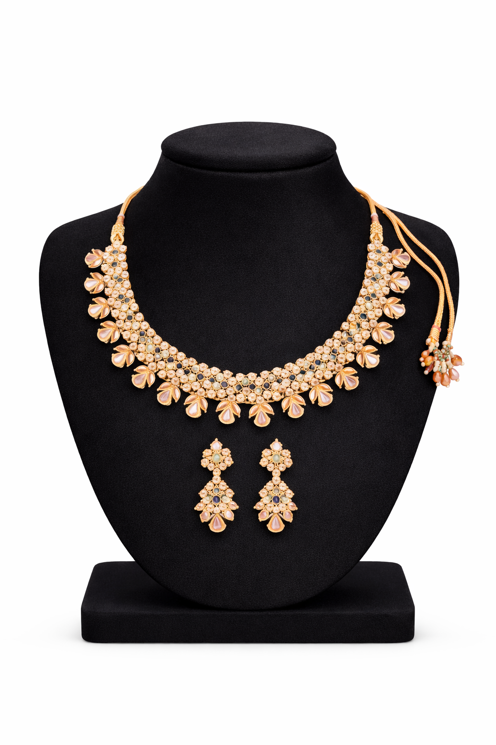 This elegant necklace set features a beautifully crafted gold-tone base adorned with soft peach teardrop stones and sparkling clear cubic zirconia. Designed in a graceful floral pattern, the necklace sits perfectly on the neckline, creating a rich and refined look. The set is completed with matching drop earrings that mirror the same intricate detailing.Ideal for weddings, engagements, festive occasions, and special celebrations, this peach stone necklace set pairs effortlessly with lehengas, sarees, and anarkali outfits.A perfect choice for brides and those who love timeless, graceful jewellery.