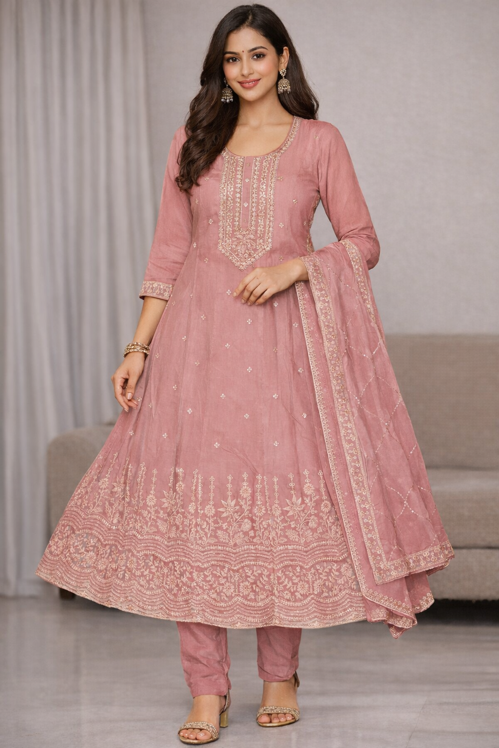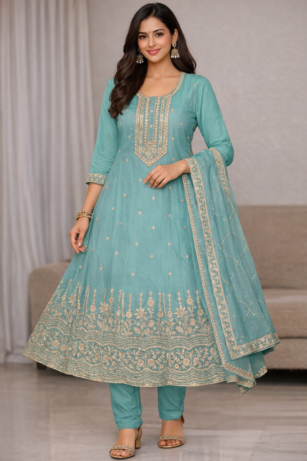 Elevate your ethnic wardrobe with this elegant Anarkali Suit, designed for timeless grace and festive charm. Crafted in a soft, flowy fabric, the Anarkali features delicate all-over embroidery with intricate gold thread work that adds a refined, luxurious touch.The round neckline is beautifully highlighted with detailed embroidery, complemented by matching embroidered sleeve cuffs and a richly embellished hemline that enhances the flare of the silhouette. The suit is paired with coordinated straight-fit pants and a matching dupatta adorned with subtle embroidery and a graceful border, completing the look effortlessly.Perfect for festive occasions, family functions, weddings, and evening gatherings, this Anarkali suit offers both comfort and elegance in one classic ensemble.