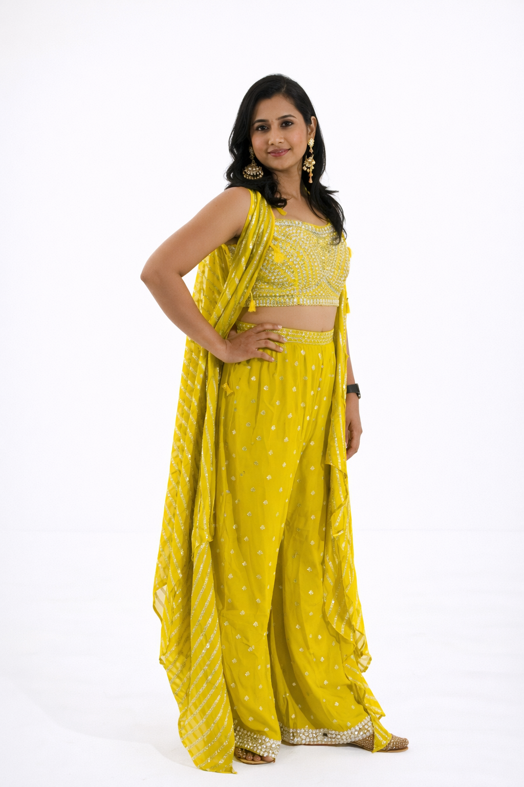 The ensemble consists of three main components: the jacket, the plazo pants, and the short tops.