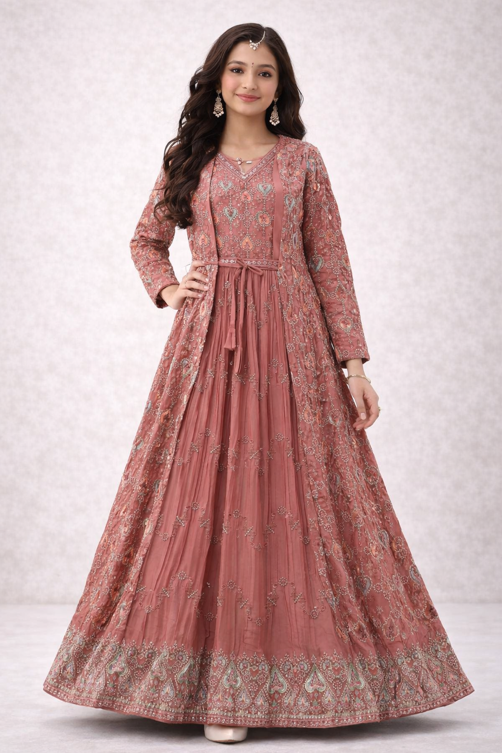 Add timeless elegance to your festive wardrobe with this beautifully crafted girls full-length gown. Designed with a graceful silhouette, this gown features intricate all-over embroidery with delicate floral and paisley motifs that enhance its rich ethnic appeal. The pleated flare creates a stunning flow, making it perfect for special occasions.