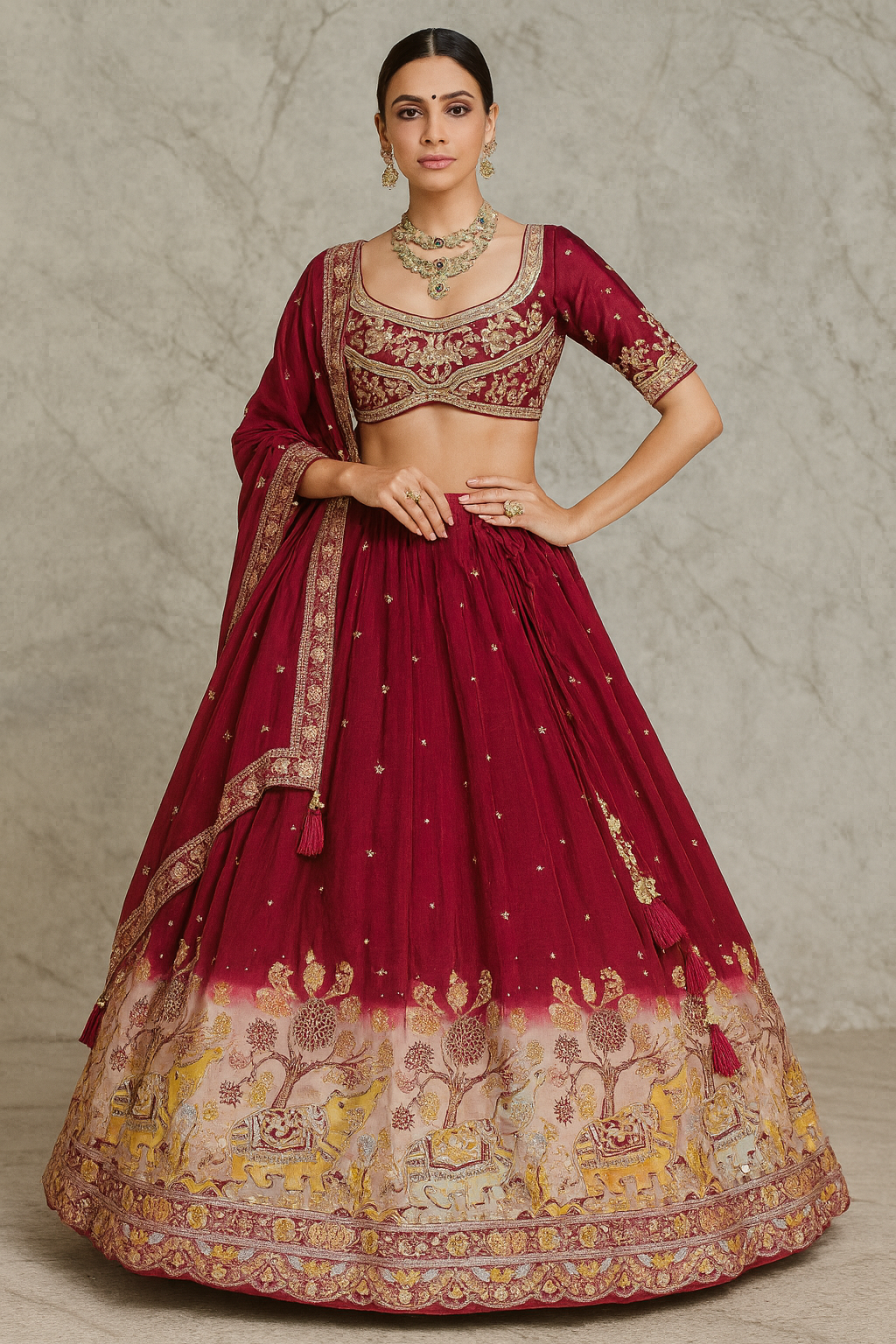 Step into timeless elegance with this breathtaking maroon lehenga set, exquisitely crafted for grand celebrations. The richly embroidered blouse features intricate gold zari and thread work with a beautifully contoured neckline, creating a regal and flattering silhouette. The flowing lehenga skirt is adorned with delicate gold buti motifs and finished with a stunning statement border showcasing traditional artwork inspired by royal Indian heritage.The ensemble is completed with a matching maroon dupatta detailed with ornate borders and tassel accents, adding movement and grace to the overall look. Designed for brides and festive divas, this lehenga is a perfect blend of tradition, craftsmanship, and luxury.