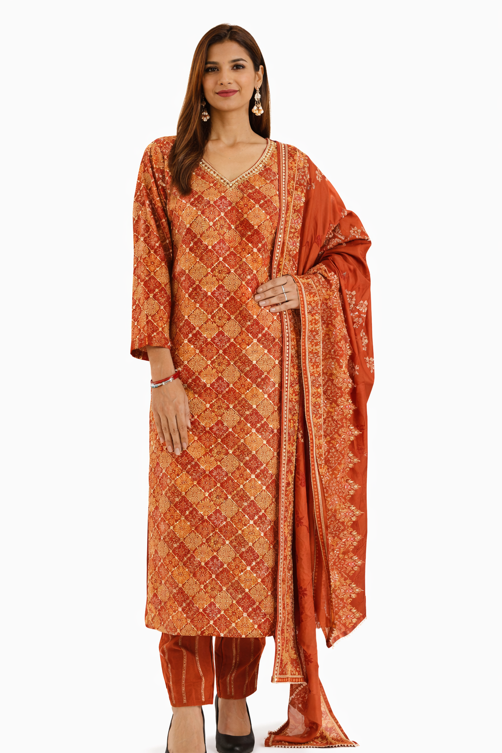 Elevate your ethnic wardrobe with this richly printed straight suit set, designed in warm rust and copper tones for a striking traditional look. The kurta features an all-over geometric print accented with a beautifully detailed neckline, giving it a refined yet vibrant appeal. Paired with matching straight pants and a coordinated printed dupatta with contrast borders, this ensemble is perfect for festive gatherings, cultural events, and elegant day wear.