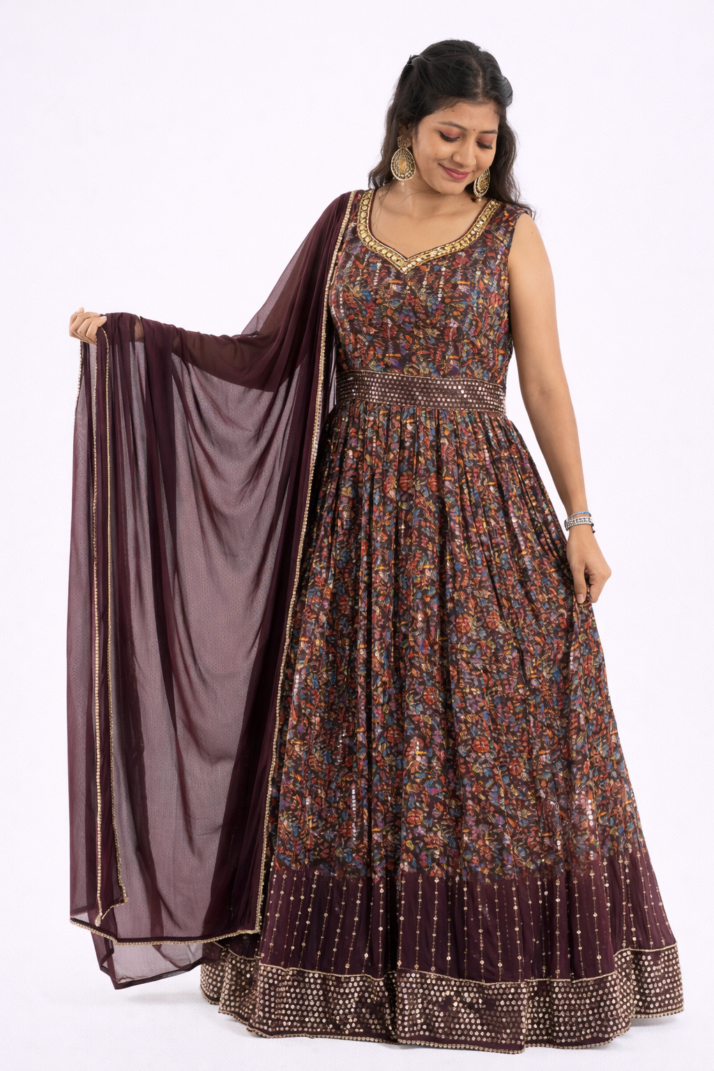 Add depth and elegance to your festive wardrobe with this embroidered Anarkali gown, crafted to make a graceful statement. The gown features intricate all-over multicolour embroidery that creates a rich, textured look, beautifully balanced with a deep wine base.
