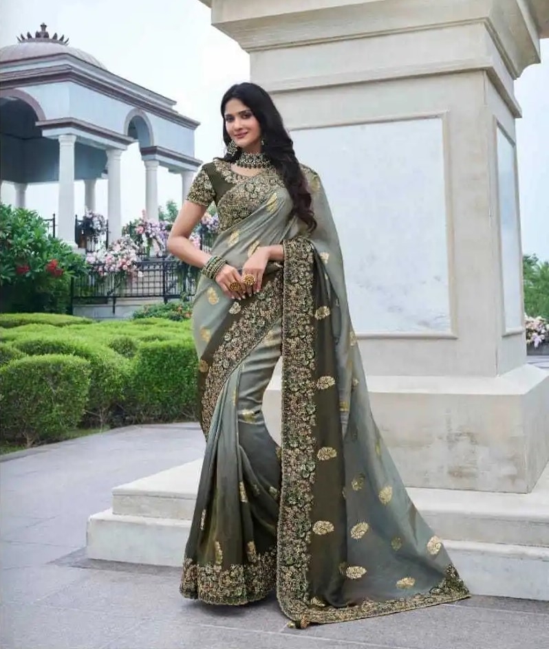 Turn heads in this elegant olive grey saree adorned with exquisite gold zari embroidery and detailed sequin work. The luxurious satin-georgette fabric drapes beautifully, reflecting grace and sophistication. Its intricately embroidered border adds a royal touch, while the matching designer blouse enhances its overall grandeur.Perfect for weddings, festive occasions, and grand celebrations, this saree blends traditional craftsmanship with a modern palette, making it a timeless addition to your wardrobe.Color: Olive GreyFabric: Satin GeorgetteWork: Heavy Zari, Sequin & Thread EmbroideryBlouse: Matching embroidered blouse (unstiched/semi-stitched)Occasion: Wedding, Festive, Party WearCare: Dry Clean Only