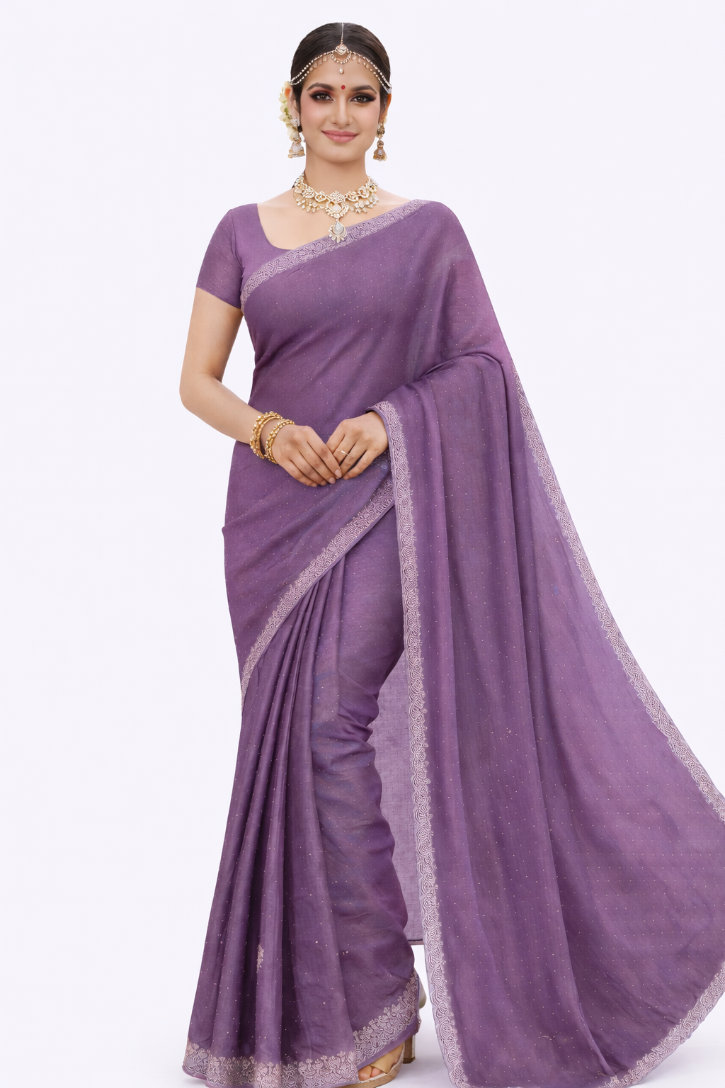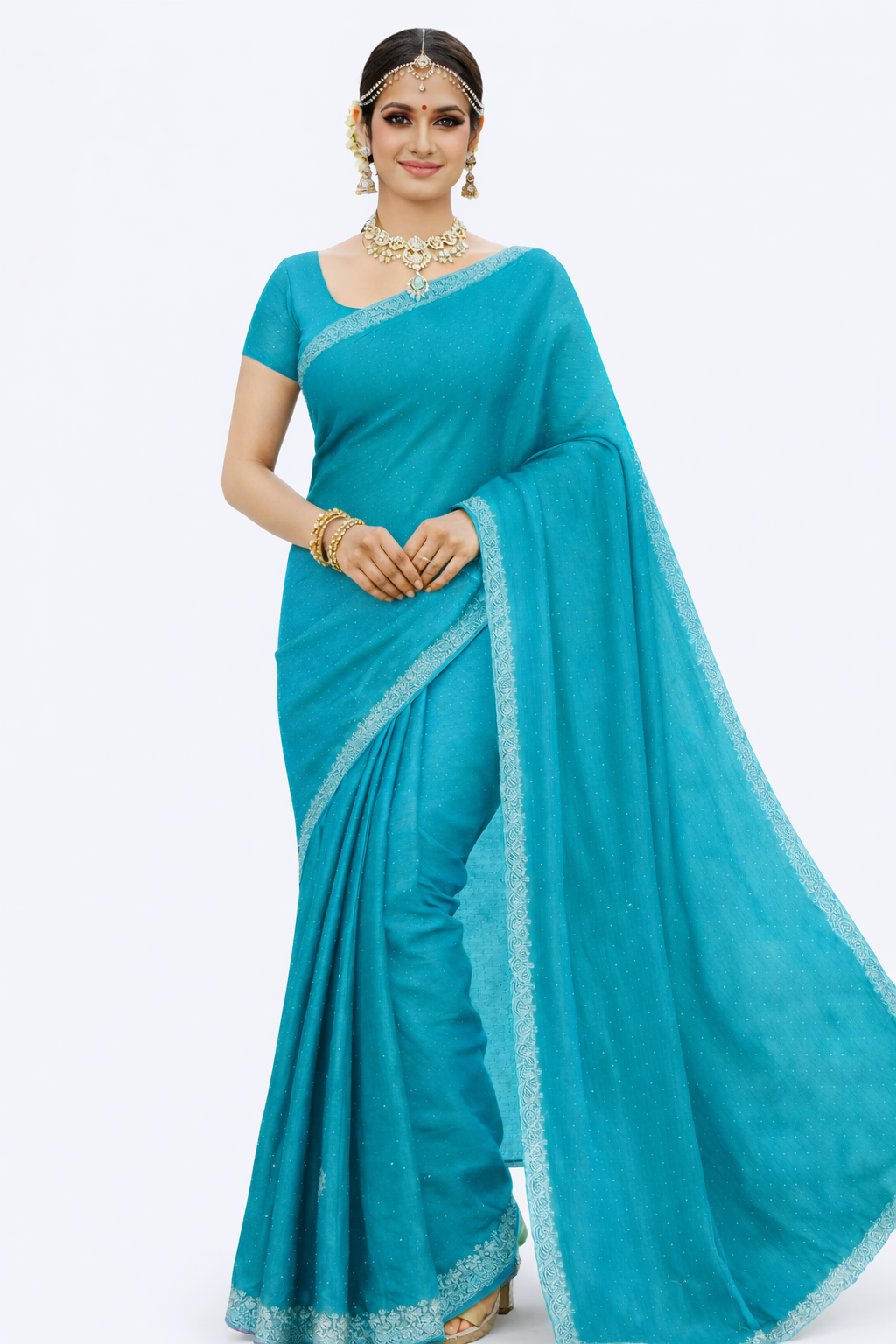 Elevate your festive and occasion wardrobe with this graceful Tissue Saree, designed to reflect timeless sophistication. Crafted in lightweight tissue fabric, this saree features a soft shimmering finish that drapes beautifully and enhances every silhouette.The saree is detailed with delicate micro-sparkle work throughout, complemented by a refined silver lace border that adds subtle elegance without overpowering the look. Its fluid fall and airy texture make it perfect for weddings, receptions, festive gatherings, and evening celebrations.Paired with a plain matching blouse, this saree allows you to style it traditionally or accessorize boldly with statement jewelry for a grand appearance.