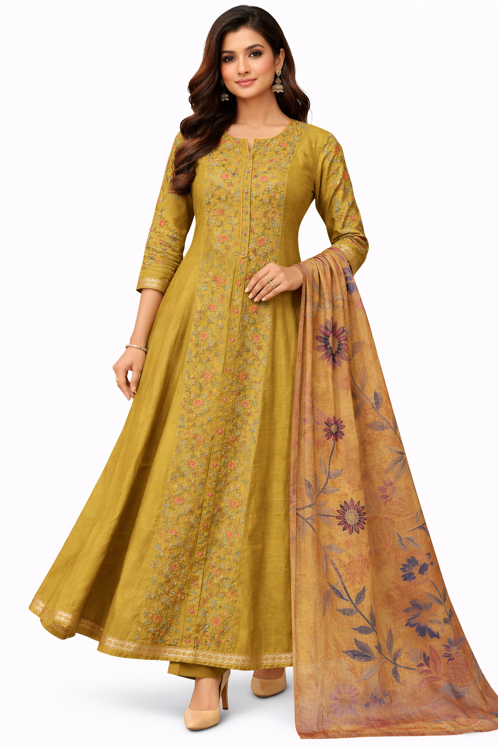 Gracefully elegant with a soft festive charm, this Mustard Dressline Suit is a perfect blend of comfort and refined detailing. The kurta features a classic dressline silhouette highlighted with delicate floral embroidery running neatly along the front panel, adding a touch of artisanal beauty to the design.Paired with matching straight pants, the look is completed with a beautifully printed dupatta in complementary tones that enhances the overall appeal. Ideal for everyday elegance, office wear, and festive gatherings, this suit offers effortless style with all-day comfort.