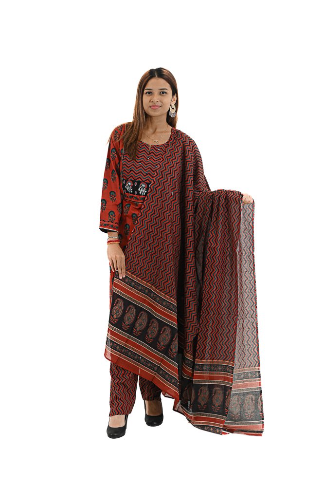 Elevate your everyday ethnic style with this elegant Navy Blue& Maroon Printed Suit Set, designed for timeless sophistication and effortless comfort. The straight-cut kurta features delicate all-over traditional motifs, beautifully complemented by an intricately embroidered neckline with subtle contrast accents. Three-quarter sleeves with neat finishing add to its refined appeal.