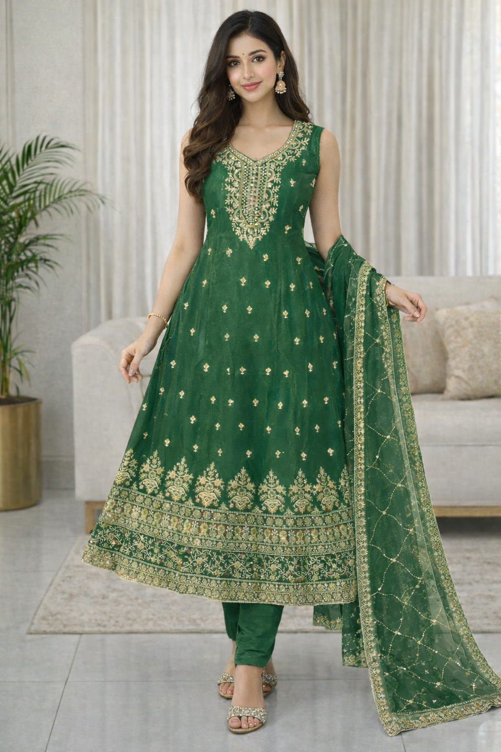 Elevate your ethnic wardrobe with this elegant Anarkali suit, beautifully crafted for timeless appeal. The Anarkali features intricate gold embroidery on the neckline and a richly detailed embroidered hem, complemented by delicate motifs spread across the flared silhouette. Designed to create graceful movement, this outfit offers a perfect blend of tradition and sophistication.The set comes complete with a matching straight pant and a sheer embroidered dupatta, adding a refined finishing touch. Ideal for festive occasions, weddings, evening functions, and special celebrations, this Anarkali suit ensures a regal and flattering look.Anarkali Kurta, Pant, DupattaPremium blend fabric with embroidered detailingV-neck with heavy embroideryFlared Anarkali silhouetteFestive wear, weddings, parties, traditional functionsDry clean recommended to maintain embroidery and color richness