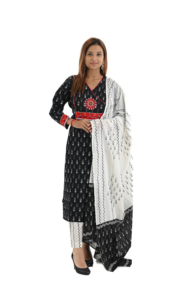 Step into effortless elegance with this Black & White Ethnic Suit Set, designed to celebrate classic contrasts with vibrant detailing. The straight-cut black kurta is adorned with delicate all-over white motifs and highlighted by a striking embroidered yoke in red and multicolour accents, adding a bold focal point to the look. The V-neckline and three-quarter sleeves with contrast borders enhance its refined appeal.