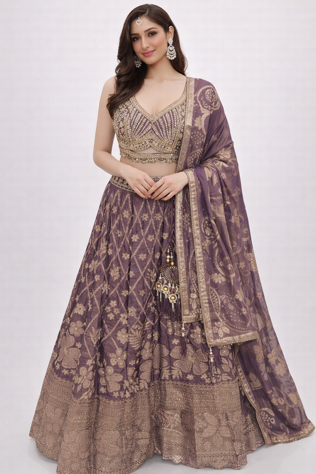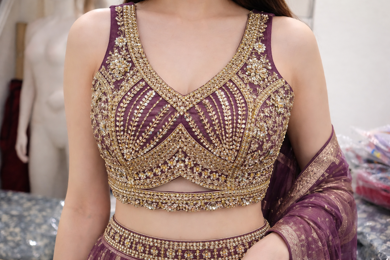 Make a statement of timeless elegance with this luxurious lehenga suit, crafted for weddings and grand festive occasions. The ensemble features a richly embellished sleeveless blouse with intricate zari, sequin, and bead embroidery, highlighted by a deep V-neckline and a beautifully designed back with dori tie-up and decorative tassels for an added touch of sophistication.The matching lehenga skirt is gracefully flared and adorned with elegant woven motifs and detailed gold accents, finished with an ornate border that enhances its regal appeal. Completing the look is a coordinated dupatta, delicately embellished with traditional patterns and fine borders, draping effortlessly for a refined, graceful finish.Perfect for bridal functions, receptions, engagements, and festive celebrations, this lehenga suit blends traditional craftsmanship with a modern silhouette, offering a premium look that stands out effortlessly.