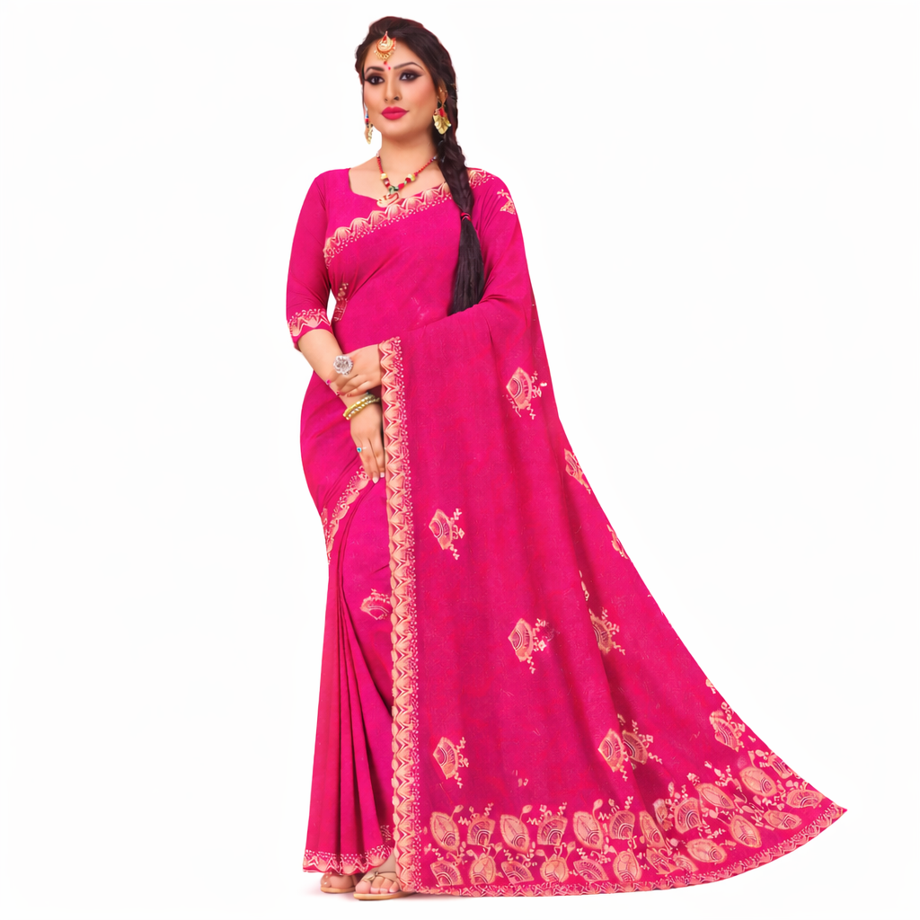 Bright, graceful, and beautifully festive — this saree is designed to make a statement with elegance. The rich rani pink tone is enhanced with delicate traditional woven motifs and a beautifully detailed border, giving it a refined ethnic look that feels both classic and eye-catching.