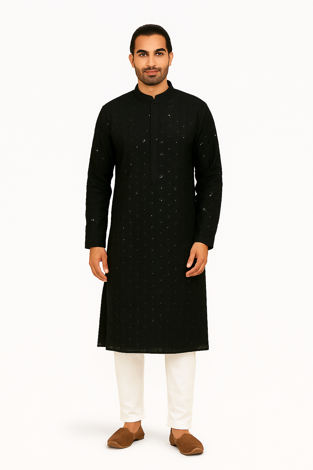 Make a bold style statement with this Men’s Black Sequin Long Kurta Set, a perfect blend of traditional craftsmanship and modern sophistication. Crafted from fine-quality fabric, this kurta features an elegant all-over self-embroidered pattern highlighted with sparkling sequin work that adds a subtle festive shimmer.