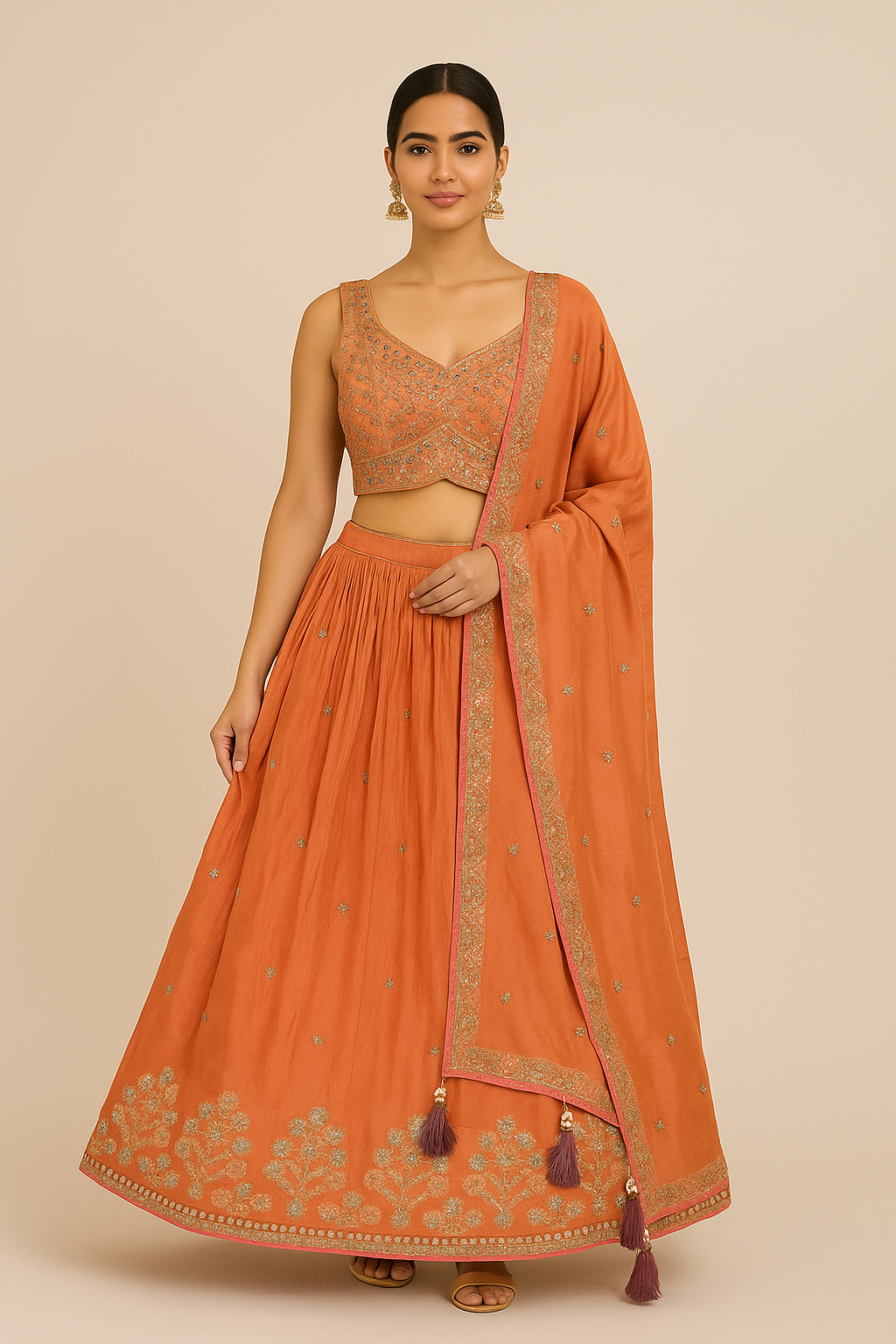 Radiate festive charm in this elegant embroidered lehenga choli set, designed to make a statement at any special occasion. The outfit features a richly detailed blouse with intricate zari, mirror, and sequin embroidery that brings a brilliant sparkle to the warm orange tone.