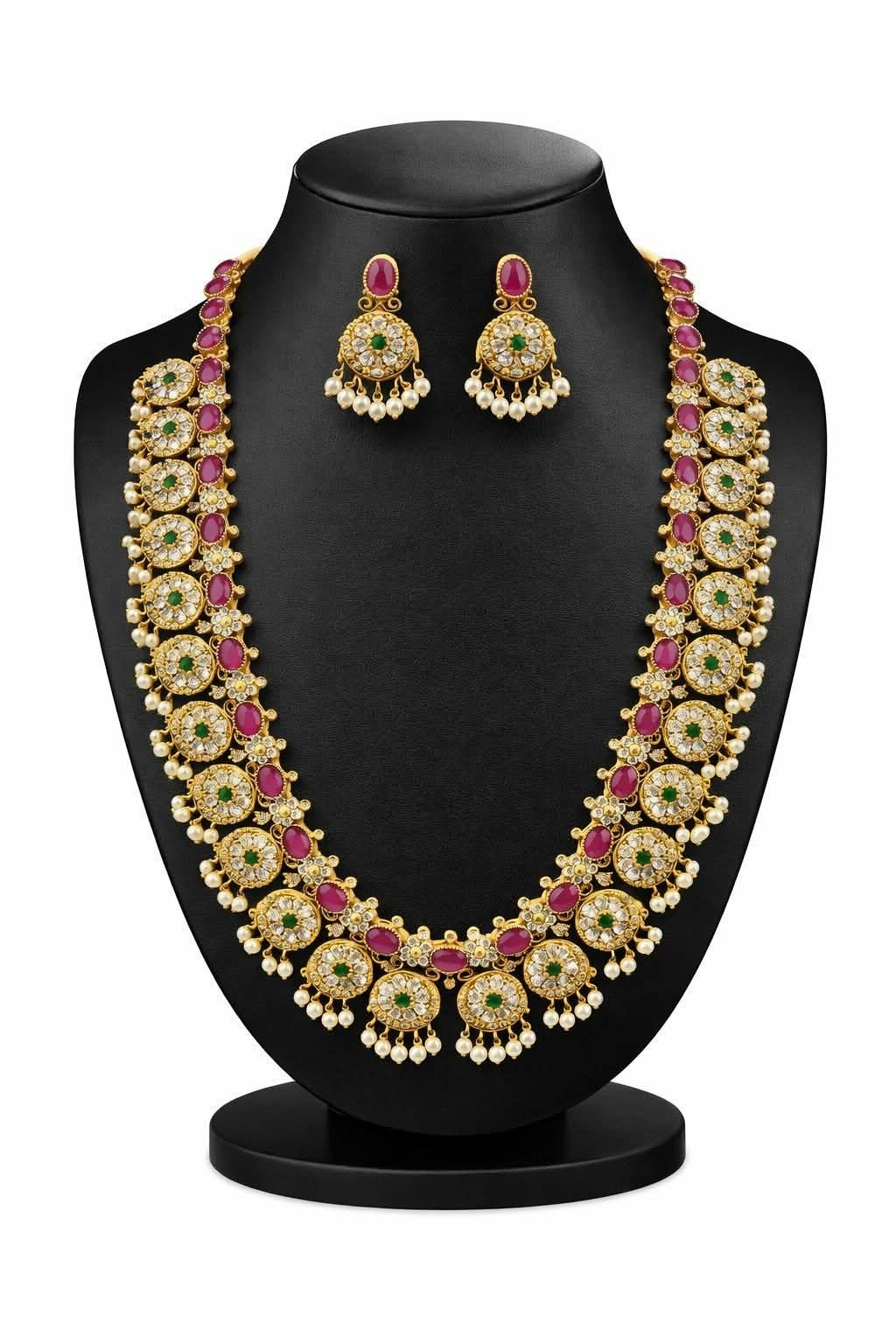 Elevate your traditional look with this stunning long necklace set, crafted to reflect royal elegance and timeless beauty. Featuring a graceful arrangement of ruby-toned oval stones, sparkling kundan work, and subtle green stone accents, this necklace is beautifully finished with delicate pearl drops that add movement and charm.The symmetrical long design sits gracefully on the neckline, making it a perfect statement piece for weddings and festive occasions. Paired with matching kundan and pearl earrings, this set brings a rich, regal touch to sarees, lehengas, and bridal ensembles.An ideal choice for brides and special celebrations where elegance matters most.
