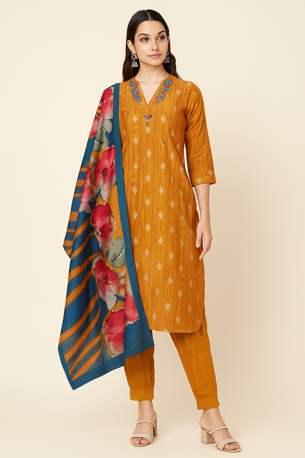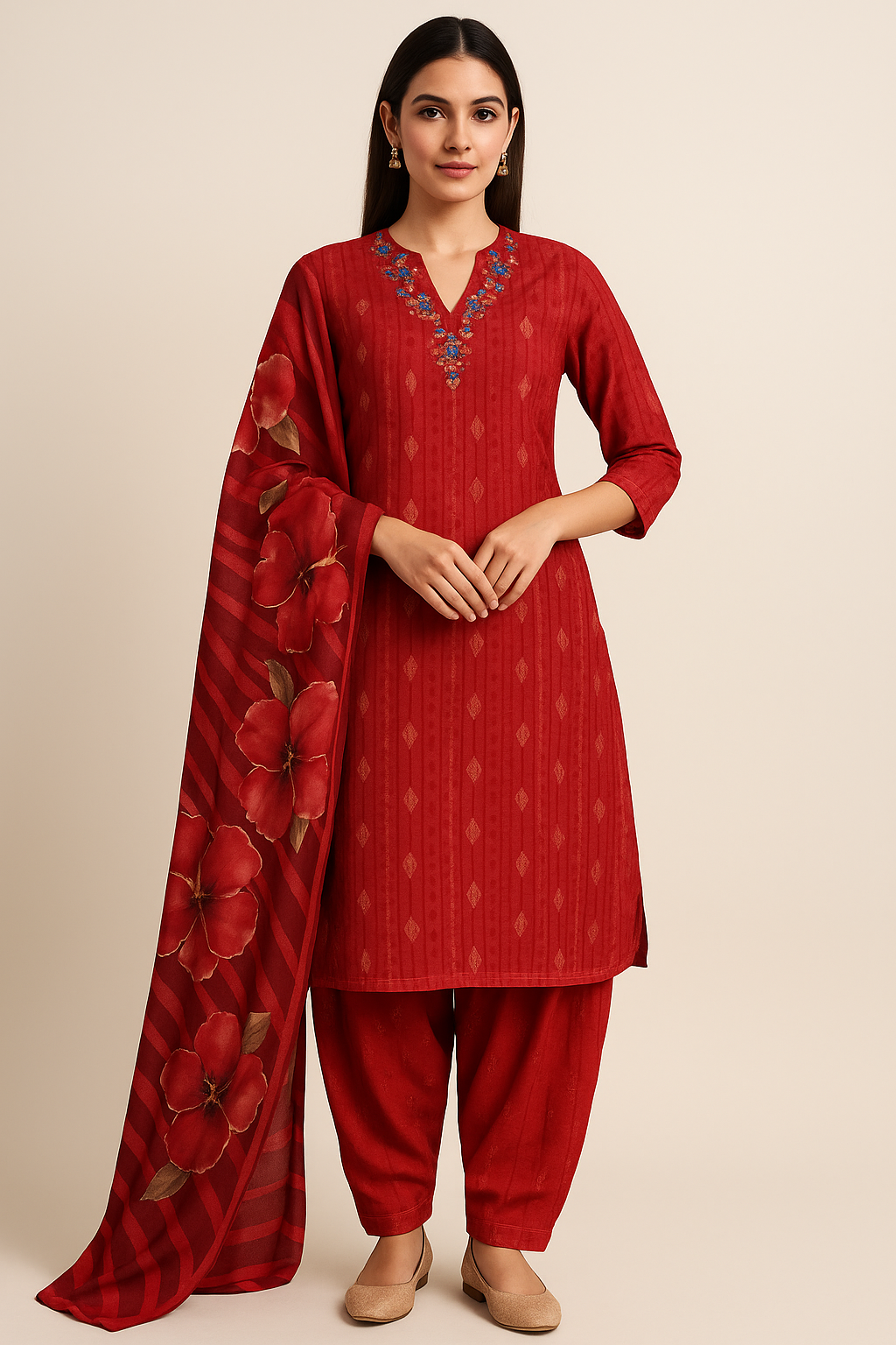 REYA ANKLE PANTS "Discover the perfect blend of simplicity and elegance with our Straight Ankle Pants Suit. Ideal for ladies who appreciate fine embroidery, this suit features delicate, elegant works on premium fabric. Paired with a beautiful floral dupatta, it offers a versatile and stylish option for any occasion, making you look effortlessly graceful and sophisticated."LADIES SIZE CHART-----------------------------------------------------| India Size | Bust (inches) | Waist (inches) | Hips (inches) |-----------------------------------------------------| L | 40-42 | 32-34 | 42-44 || XL | 44-46 | 36-38 | 46-48 || 2XL | 48-50 | 40-42 | 50-52 || 3XL | 52-54 | 44-46 | 54-56 |-----------------------------------------------------