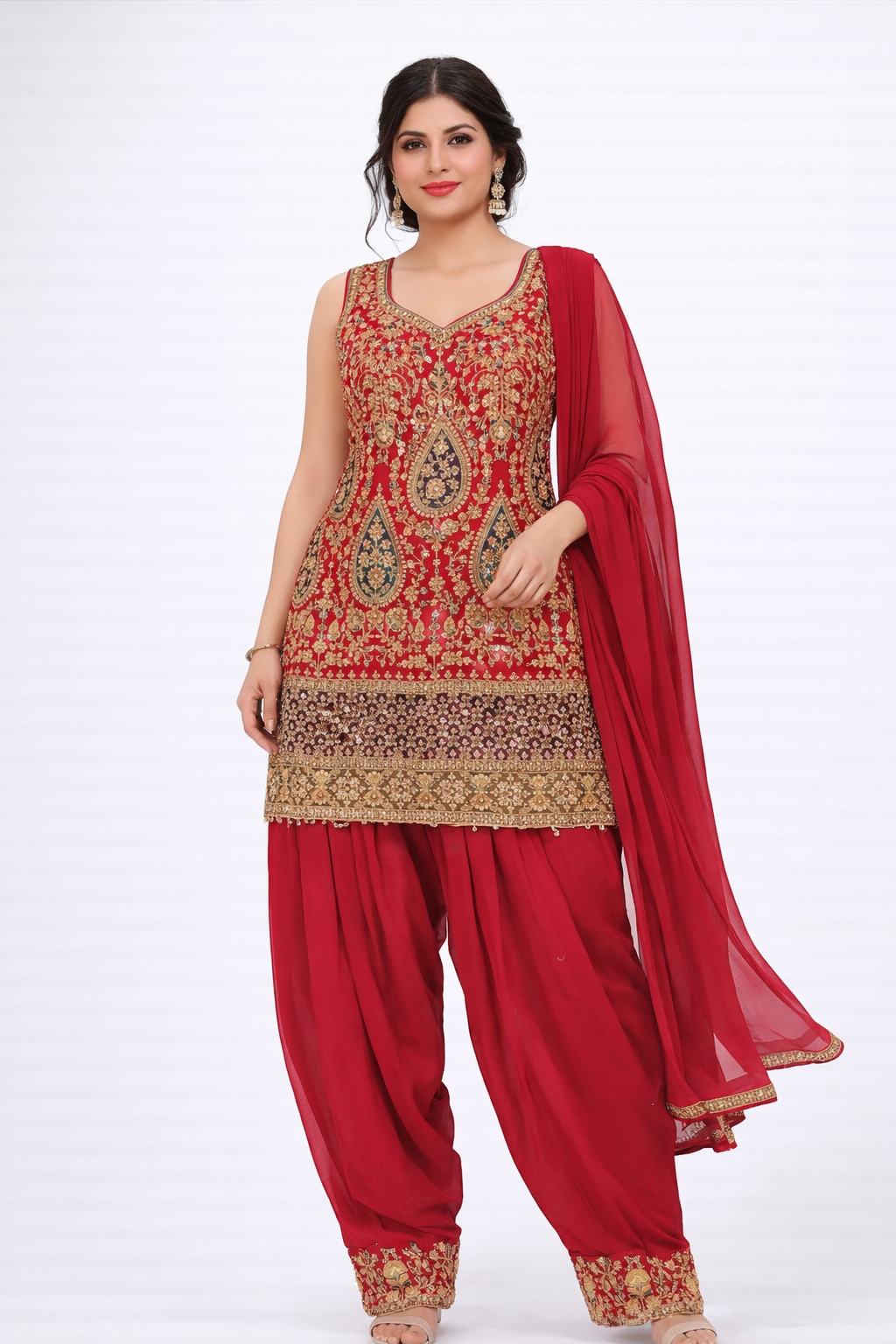 Make a striking festive statement with this Heavy Embroidered Patiala Suit, crafted to reflect timeless Punjabi elegance. The sleeveless kurti is richly adorned with intricate gold embroidery and detailed paisley motifs, beautifully highlighted against the deep red base. The heavily embroidered hem adds a luxurious finish and enhances the traditional appeal.Paired with classic pleated Patiala salwar pants, this ensemble offers both comfort and graceful volume. The look is completed with a matching sheer red dupatta, finished with subtle gold detailing, adding softness and elegance to the overall outfit.Perfect for weddings, festive occasions, mehndi functions, and cultural celebrations, this Patiala suit blends heritage craftsmanship with modern elegance.