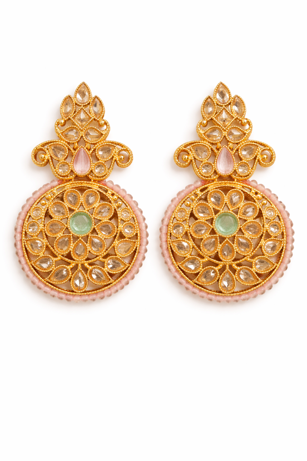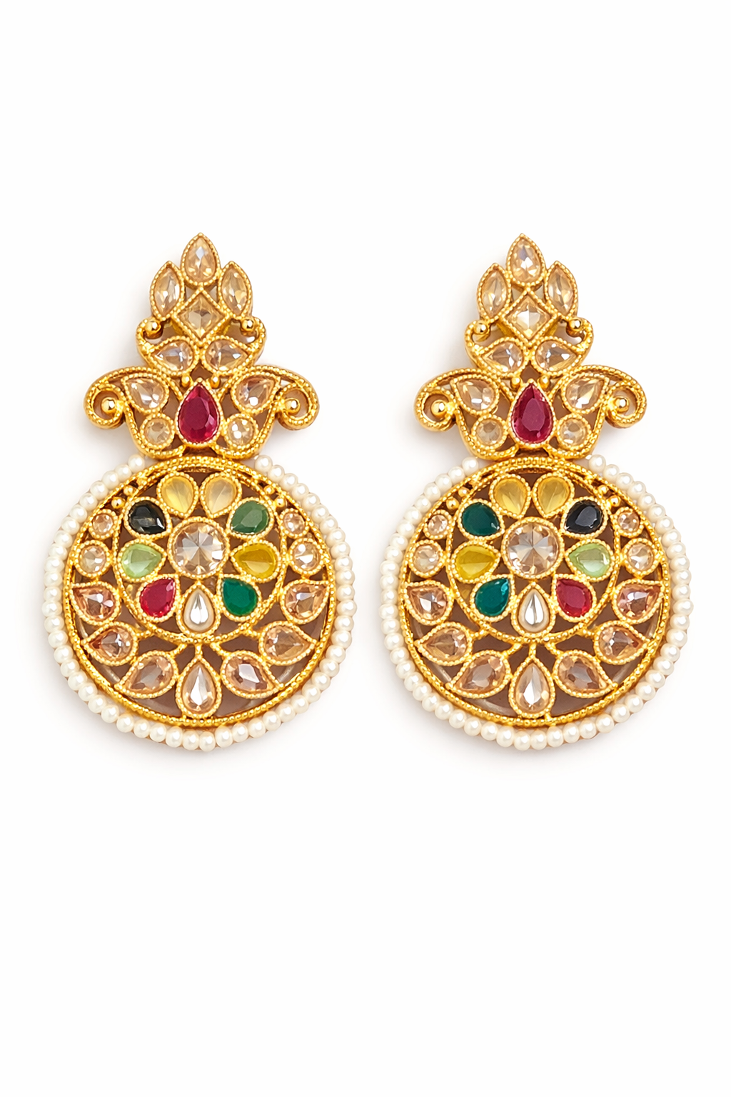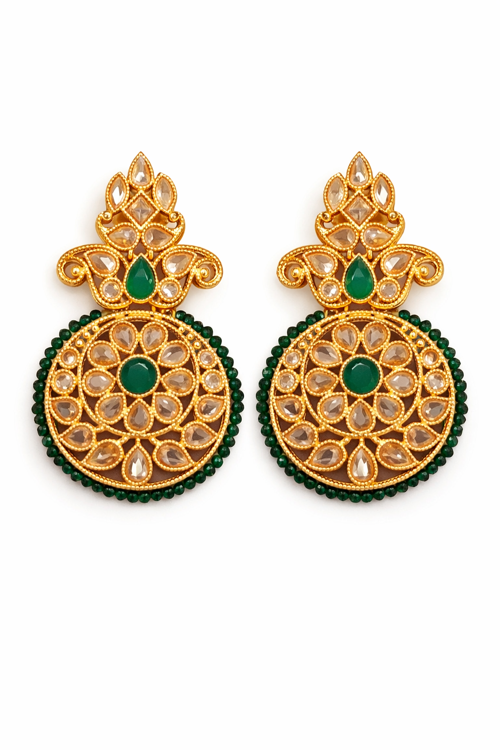 Make a statement with these exquisite traditional chandelier earrings, crafted in a rich gold-tone finish. Featuring intricate floral and paisley-inspired detailing, the design is beautifully embellished with champagne-hued stones and finished with a delicate pearl border for a classic ethnic touch. Perfect for weddings, festive occasions, and special celebrations, these earrings add timeless elegance and regal charm to any outfit.