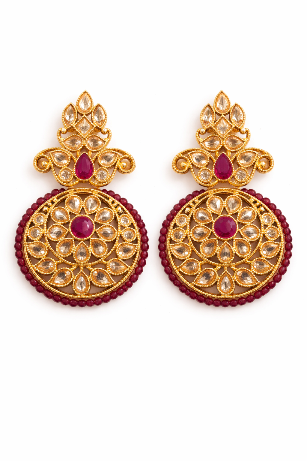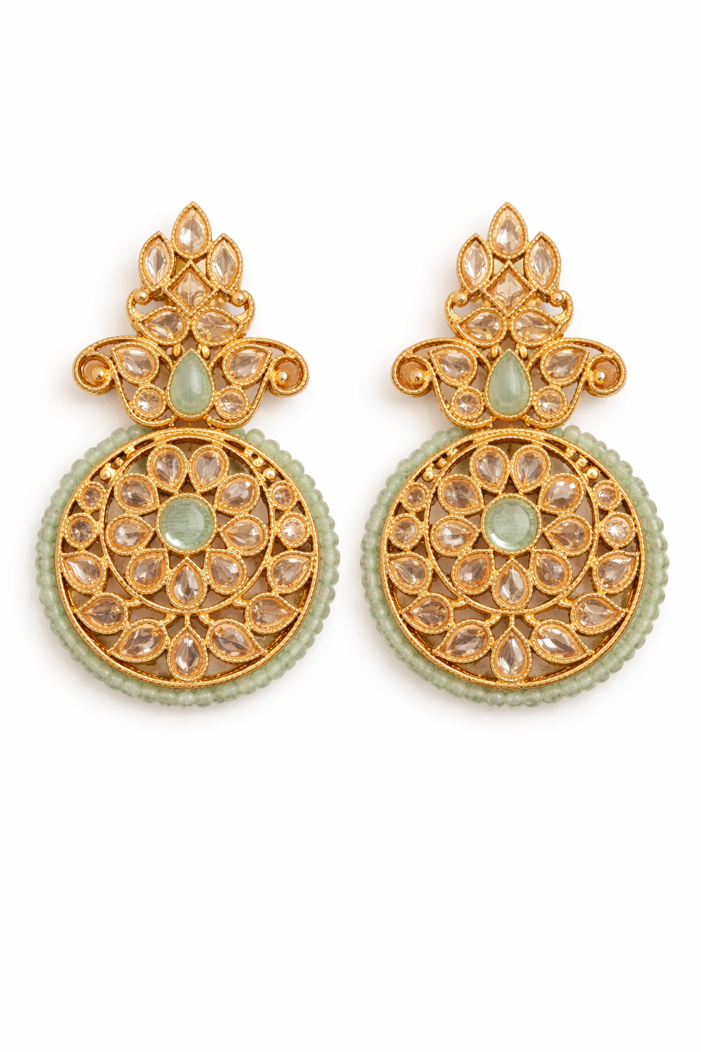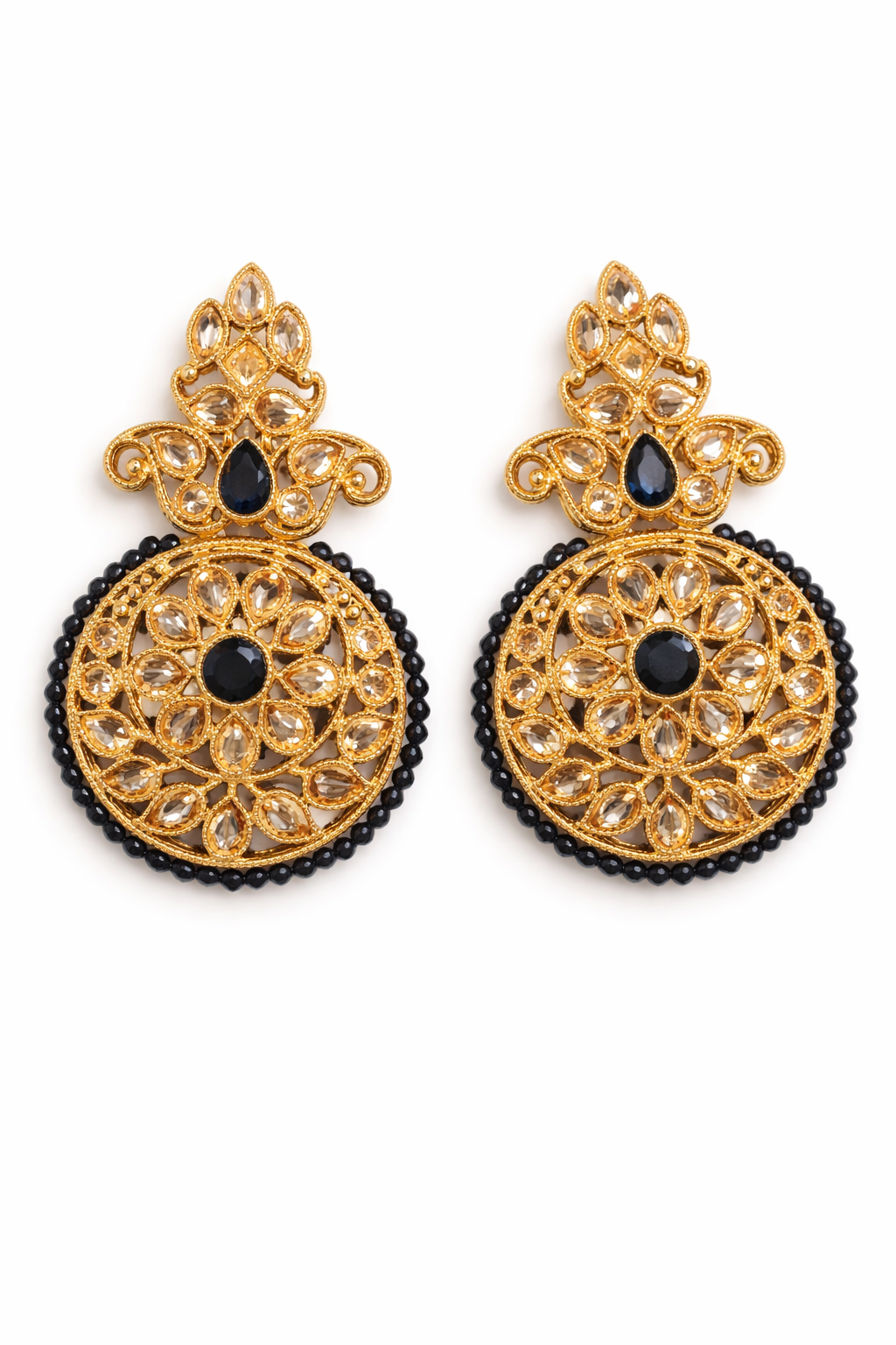 Make a statement with these exquisite traditional chandelier earrings, crafted in a rich gold-tone finish. Featuring intricate floral and paisley-inspired detailing, the design is beautifully embellished with champagne-hued stones and finished with a delicate pearl border for a classic ethnic touch. Perfect for weddings, festive occasions, and special celebrations, these earrings add timeless elegance and regal charm to any outfit.