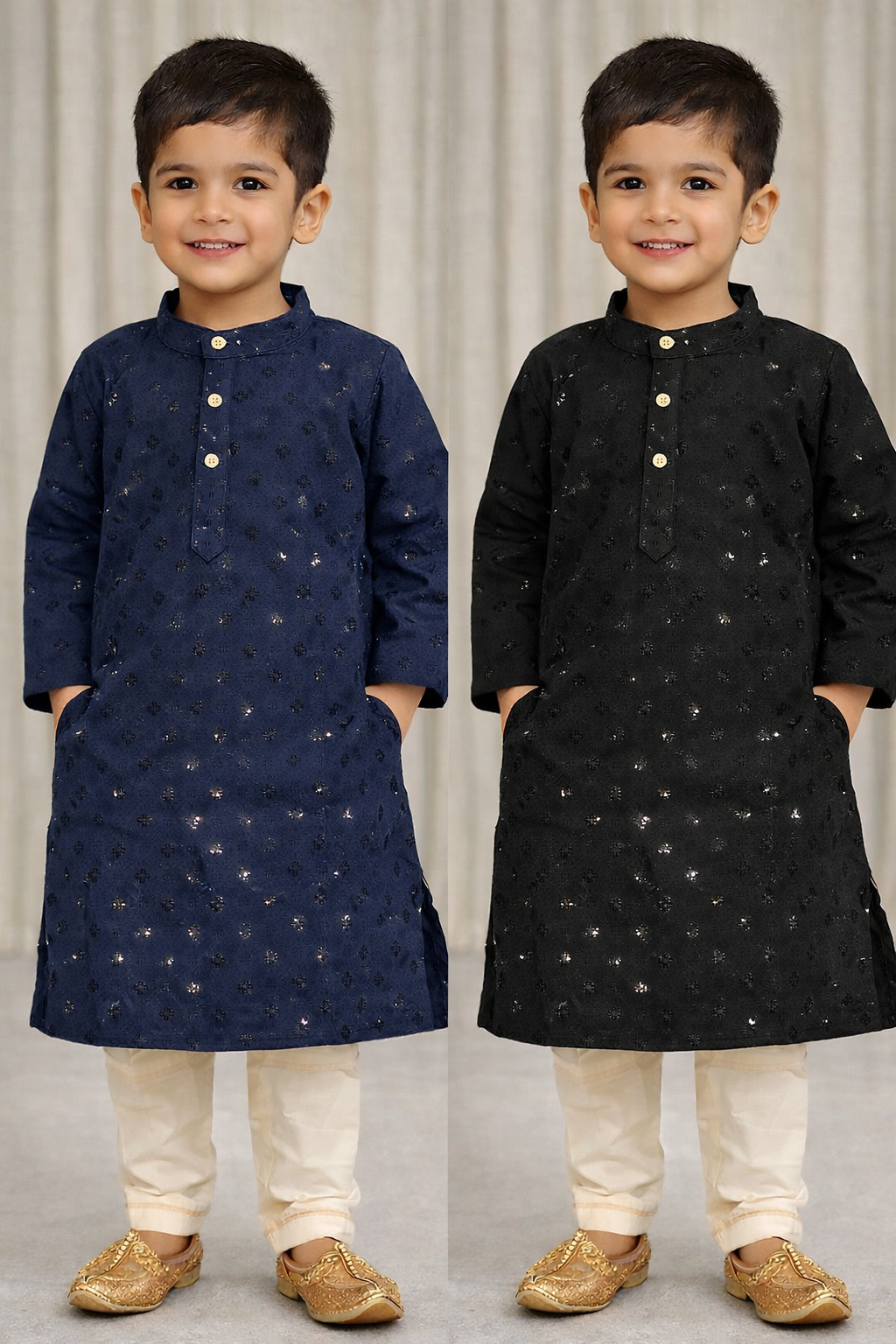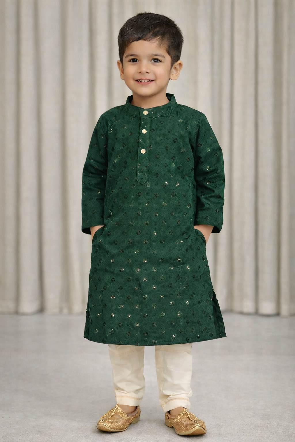 Dress your little one in festive elegance with this charming colored boys kurta set. Crafted from soft, breathable fabric, the kurta features an all-over woven pattern highlighted with subtle sequin accents that add just the right amount of sparkle for special occasions. The classic mandarin collar and front button placket give it a timeless traditional look.Paired with comfortable cream pants and traditional gold mojari shoes, this outfit is perfect for weddings, festivals, family functions, and celebrations