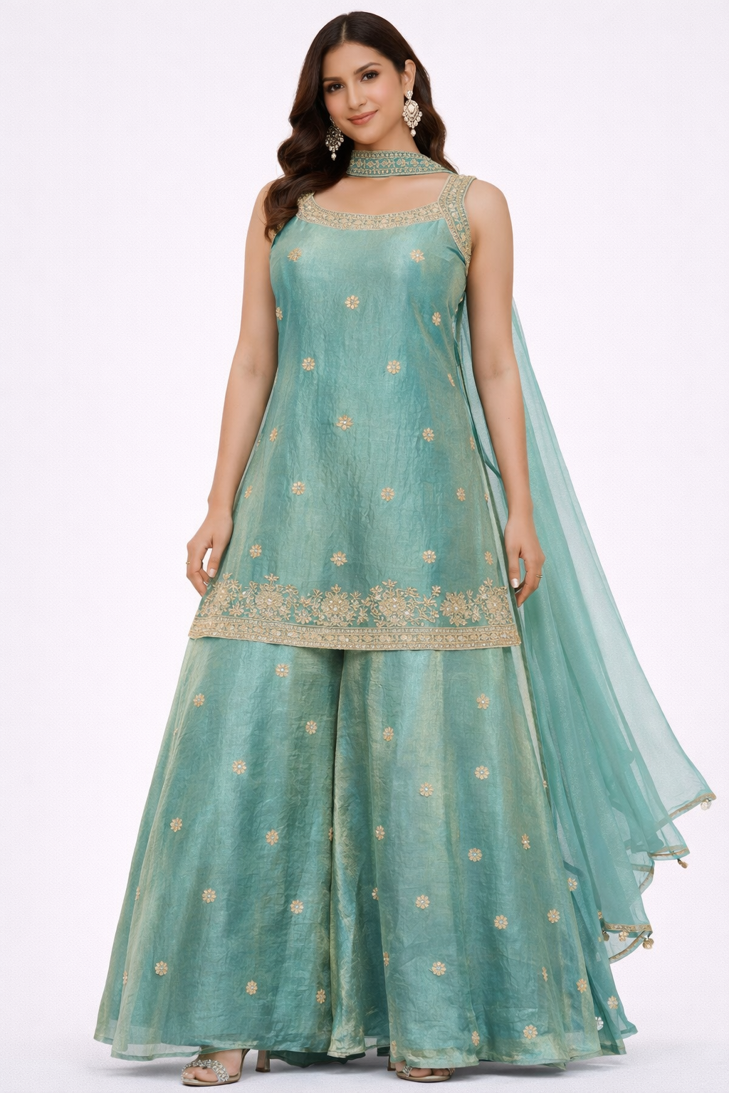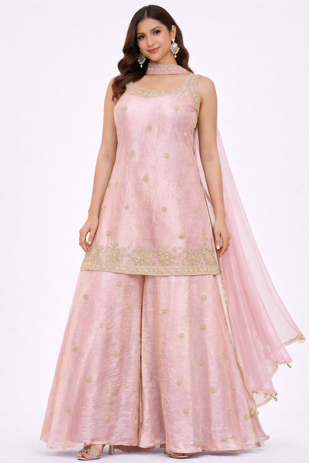Sleeveless Flare Palazzo Suit Soft, graceful, and effortlessly elegant, this light pink flare palazzo suit is designed for a refined festive look. The sleeveless kurta features delicate gold embroidery along the neckline and hem, enhanced with subtle floral butti work scattered across the fabric for a gentle shimmer. The pastel light pink tone adds a fresh, feminine charm that is perfect for day and evening occasions.The matching flared palazzo pants offer a fluid, airy silhouette with coordinated embroidery, creating beautiful movement with every step. Finished with a lightweight sheer dupatta in a matching shade, this ensemble blends comfort with understated luxury, making it ideal for celebrations where elegance is key.
