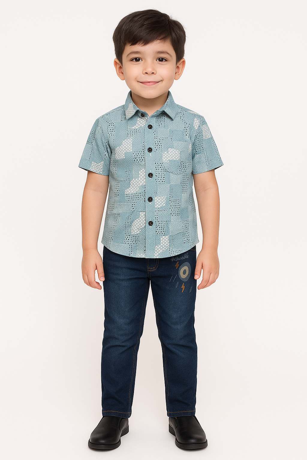 Smart and comfortable boys’ outfit featuring a soft printed collared shirt paired with blue denim — available in both long pants and shorts. Perfect for daily wear, outings and family events.