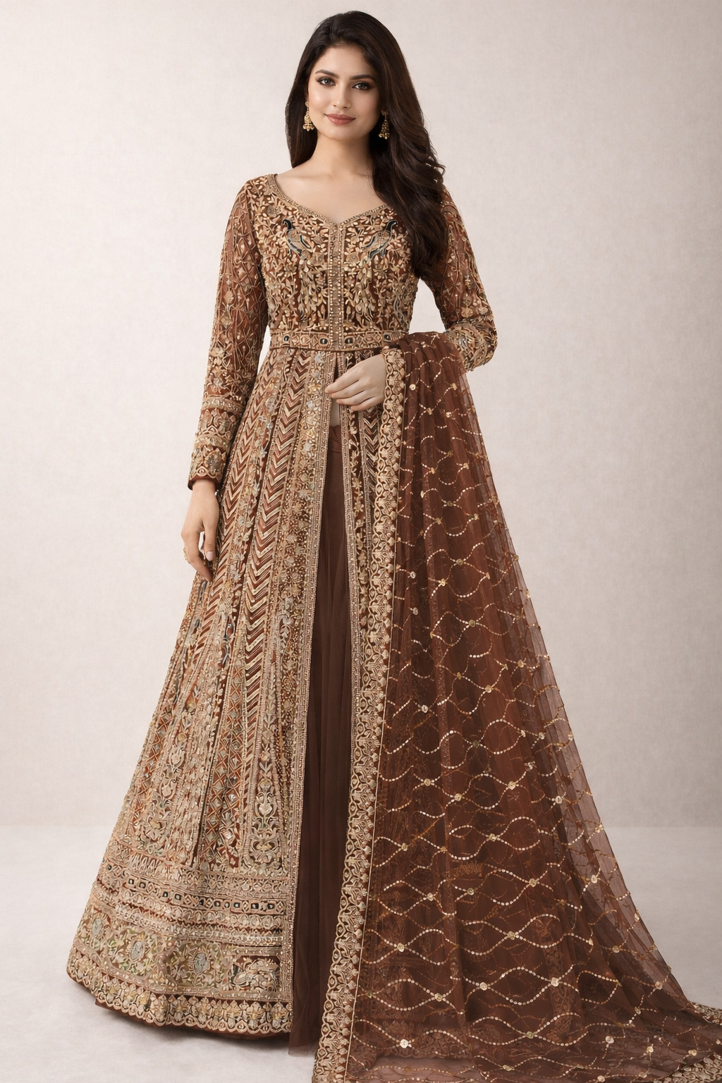 The gown flares gracefully to the floor, creating a stunning full-length look ideal for weddings, receptions, engagement ceremonies, and grand festive occasions. Paired with a matching embroidered dupatta, the outfit balances tradition and modern sophistication.