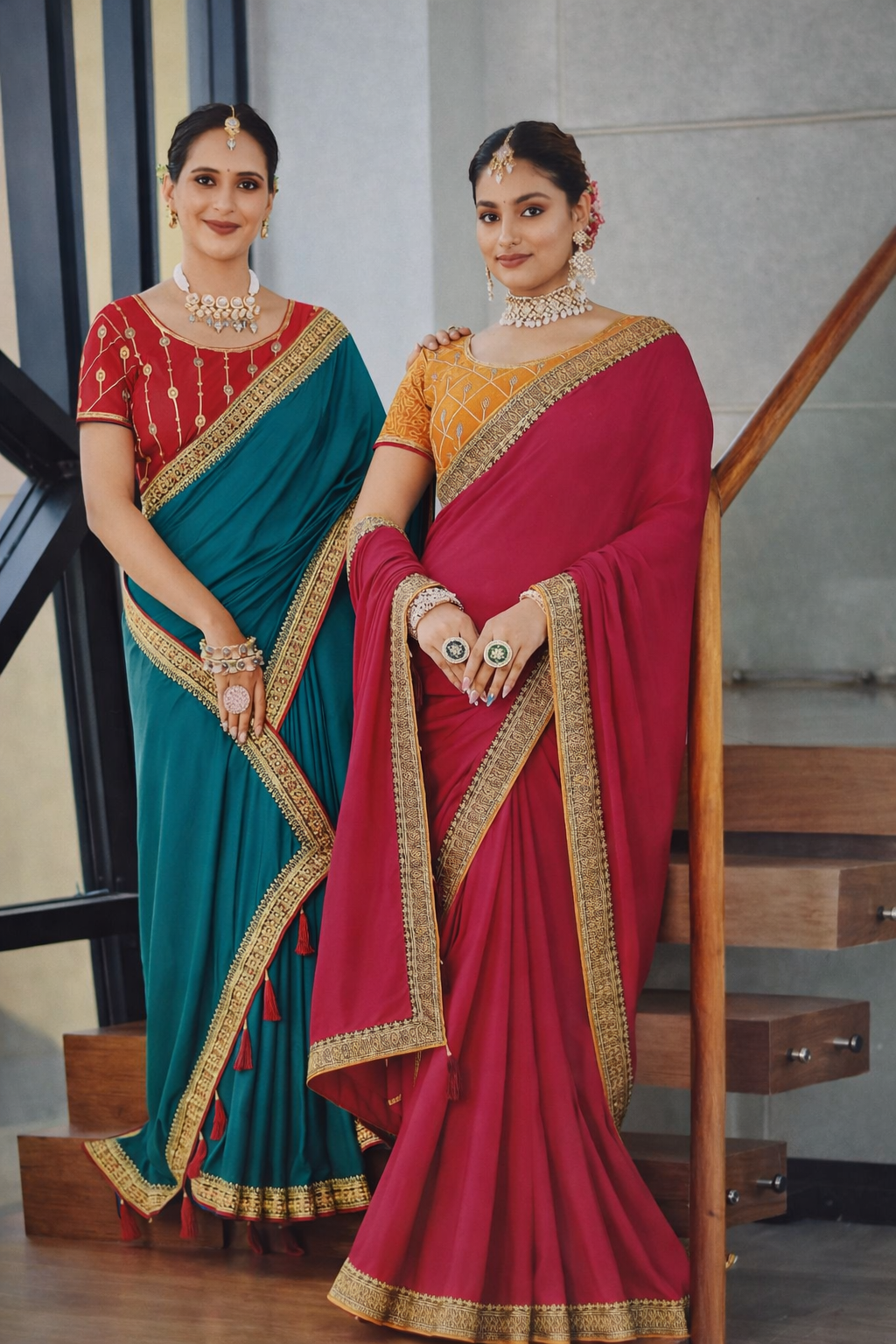 The blouse is styled in a complementary contrast shade with delicate embroidery, enhancing the overall sophistication of the ensemble. Paired with classic temple-style jewelry and neatly pleated drape, the look reflects effortless charm and poise.