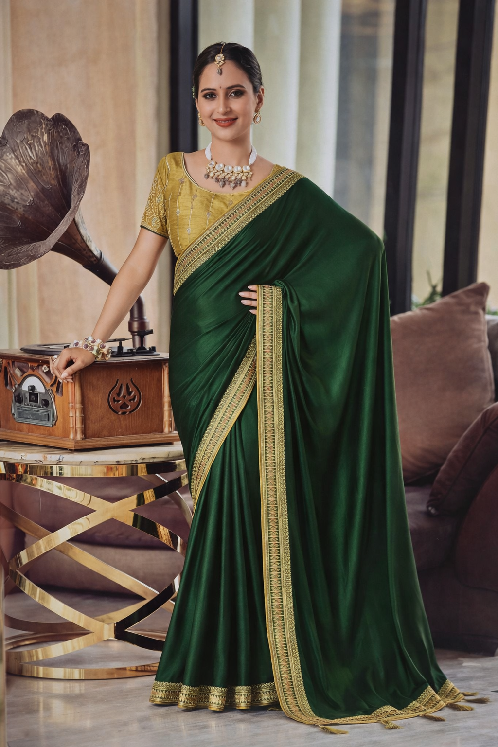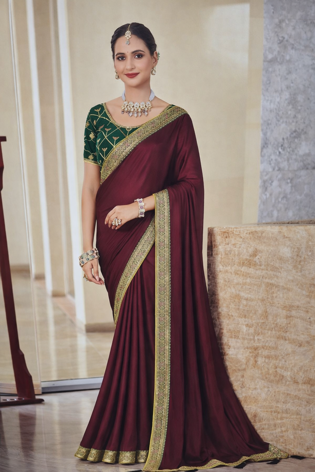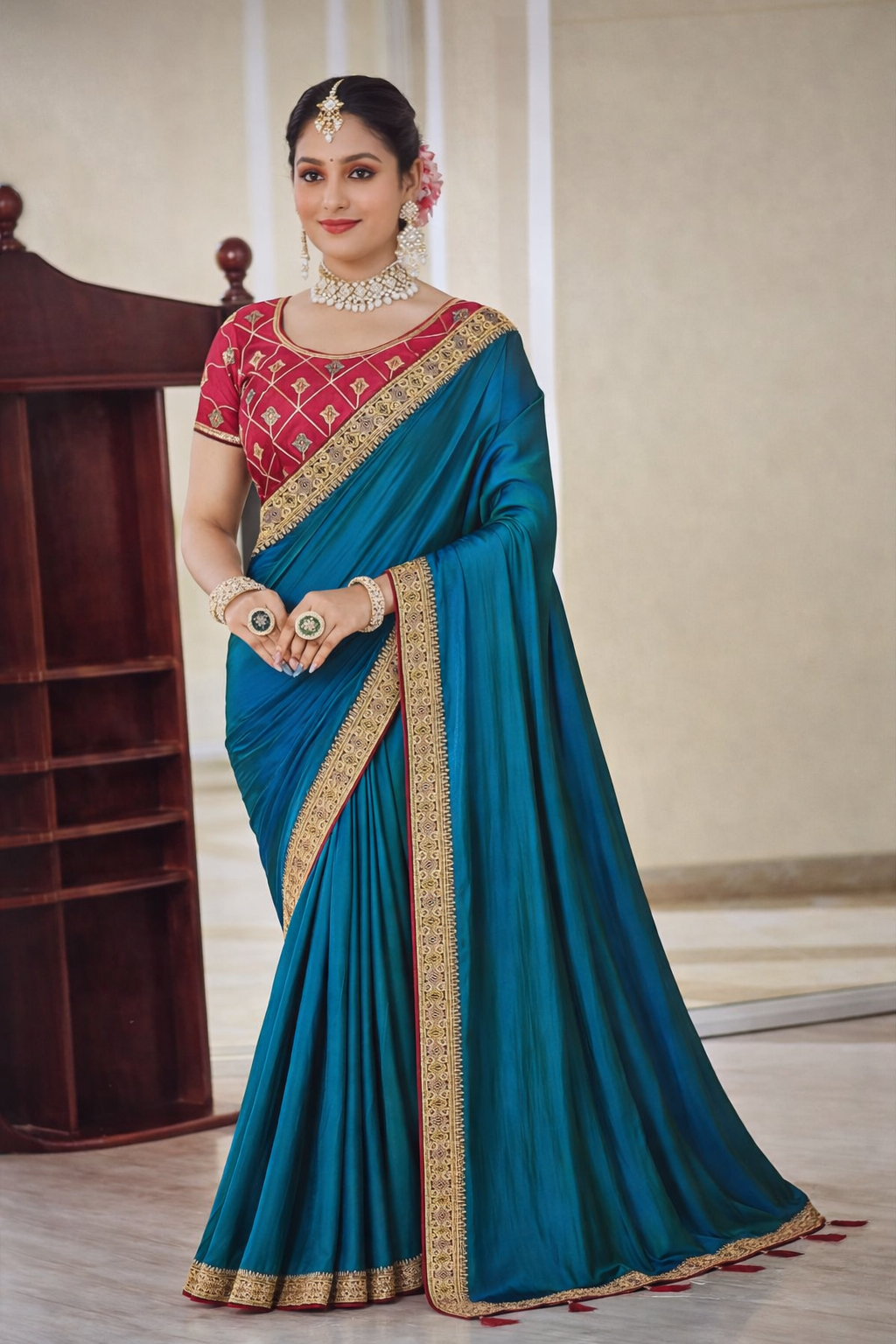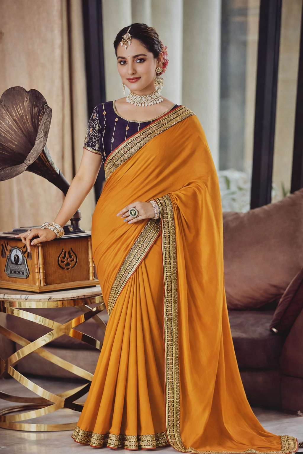 Highlights:• Soft, flowy fabric with elegant drape• Rich contrast blouse with intricate detailing• Heavy gold embroidered border for a regal finish• Perfect for weddings, festive wear, and special occasions• Styled with statement jewelry for a complete traditional look