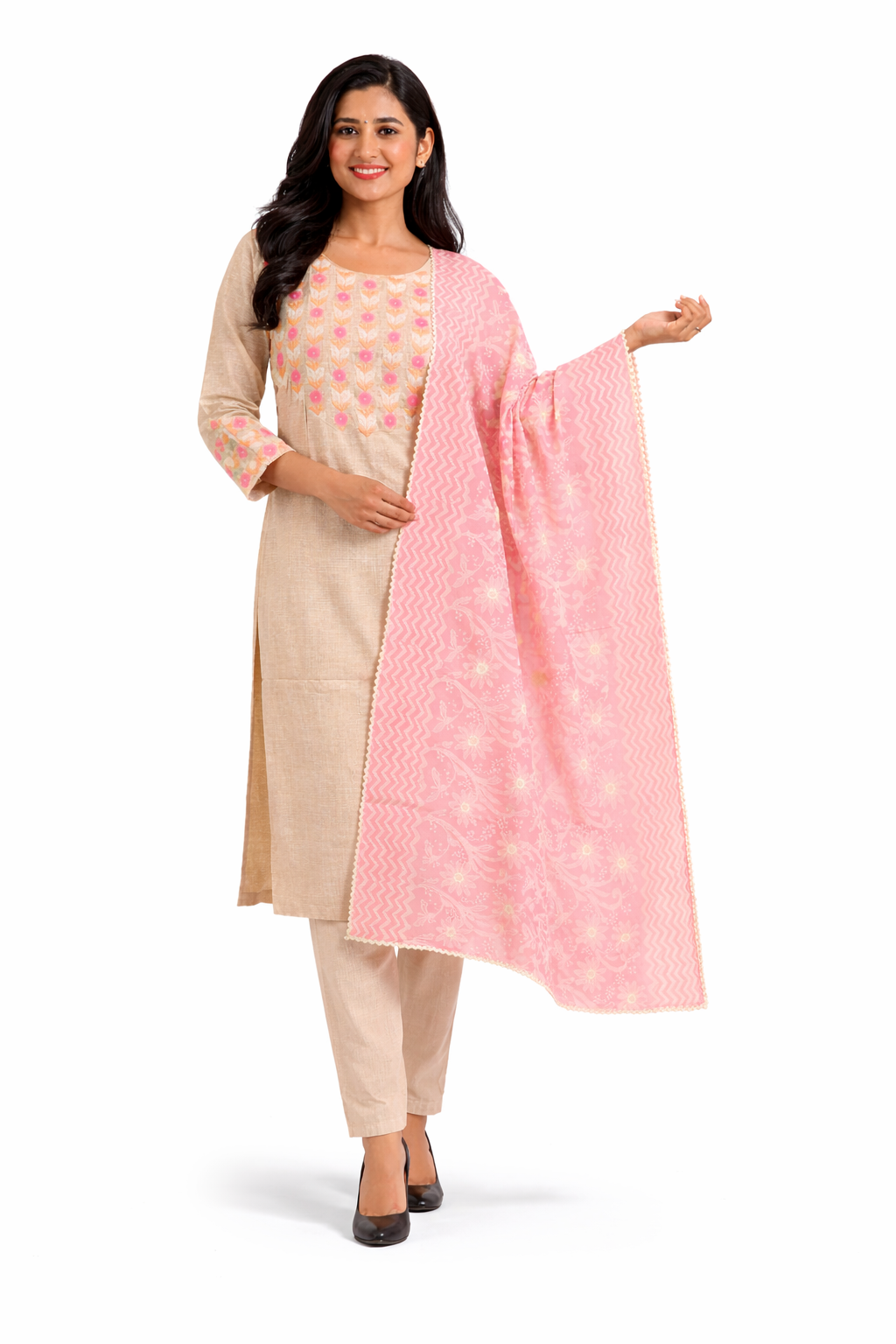 Elevate your everyday elegance with this beautifully crafted cream kurti set, designed for effortless grace and comfort. The soft neutral base is enhanced with delicate floral embroidery in subtle pink tones, creating a refined yet feminine appeal.