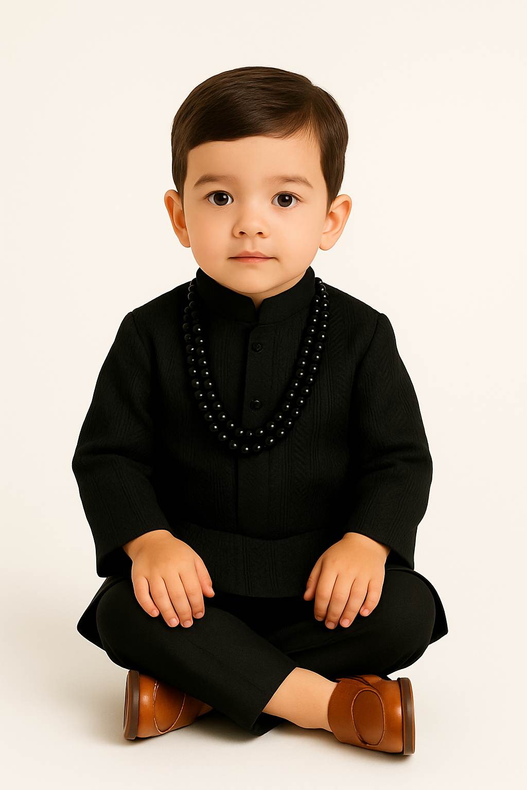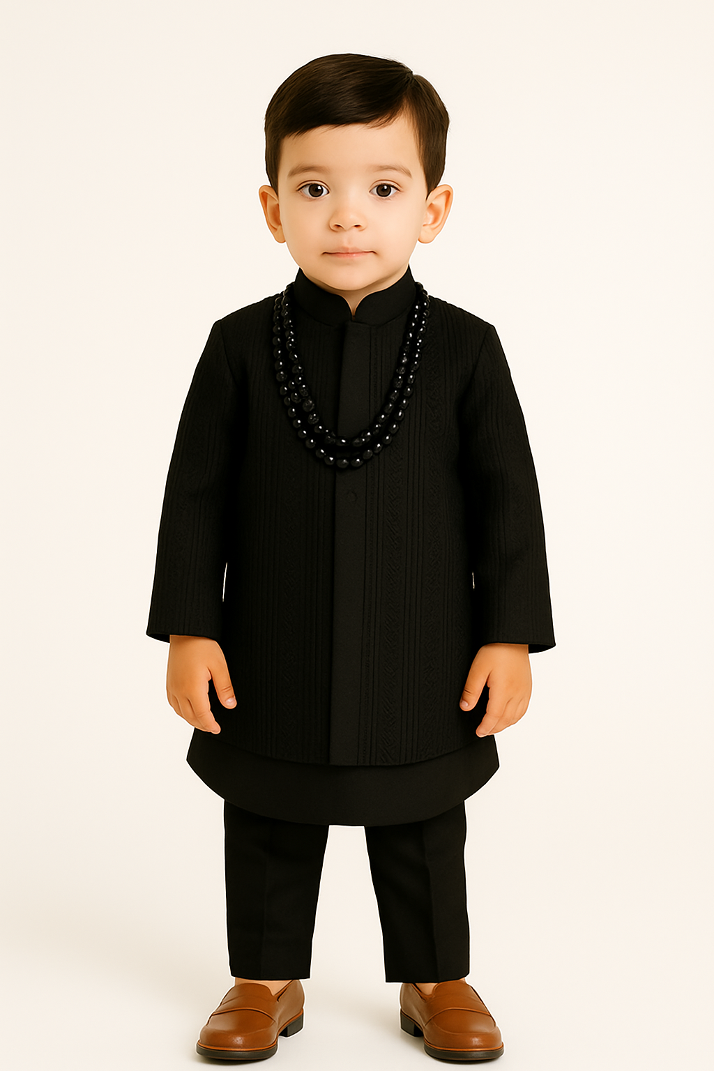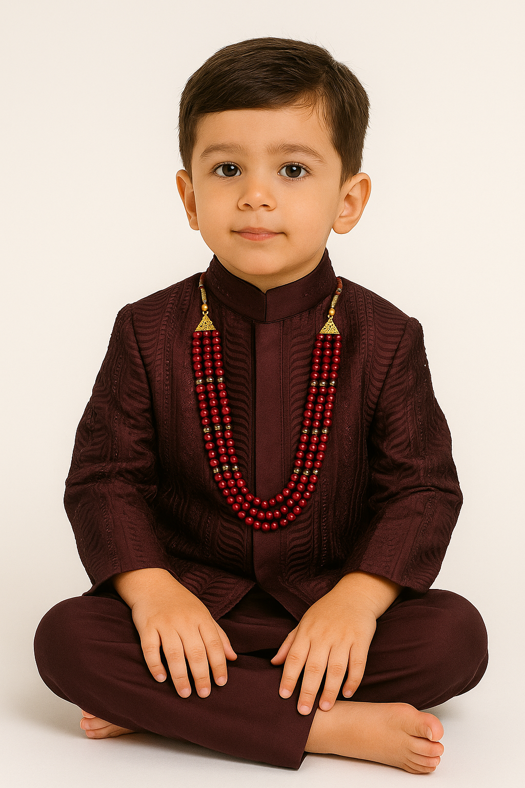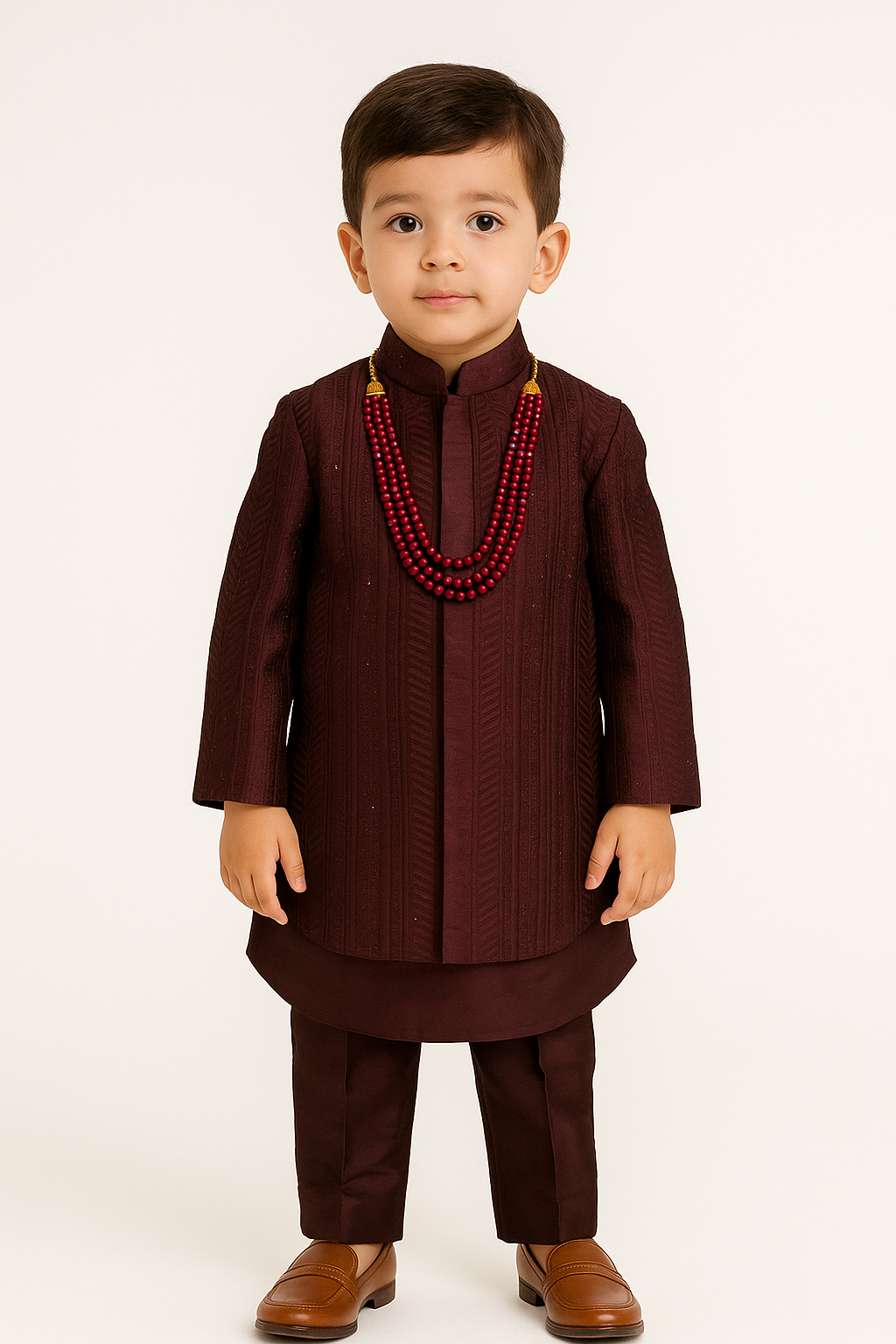 A premium traditional boys sherwani set designed for weddings, receptions, and festive celebrations. This elegant maroon ensemble features a beautifully crafted jacket with detailed textured patterns and subtle sequin work that adds a refined shimmer without overpowering the look. Paired with a matching kurta and pants, this outfit creates a rich and regal appearance perfect for special occasions.