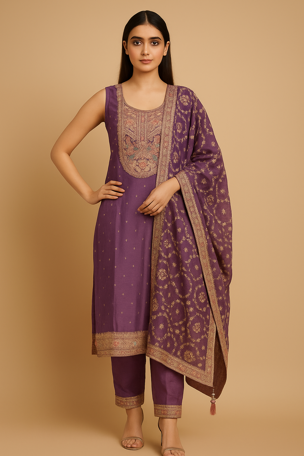 Step into elegance with this stunning salwar kameez set, beautifully designed for festive and formal occasions. The kameez features intricate gold zari and pastel thread embroidery, delicately highlighted with sequins and mirror accents for a graceful shimmer.Crafted from premium polyester fabric, this outfit combines comfort with sophistication. The ensemble includes a matching embroidered dupatta with a detailed border and solid trousers for a perfectly coordinated look.