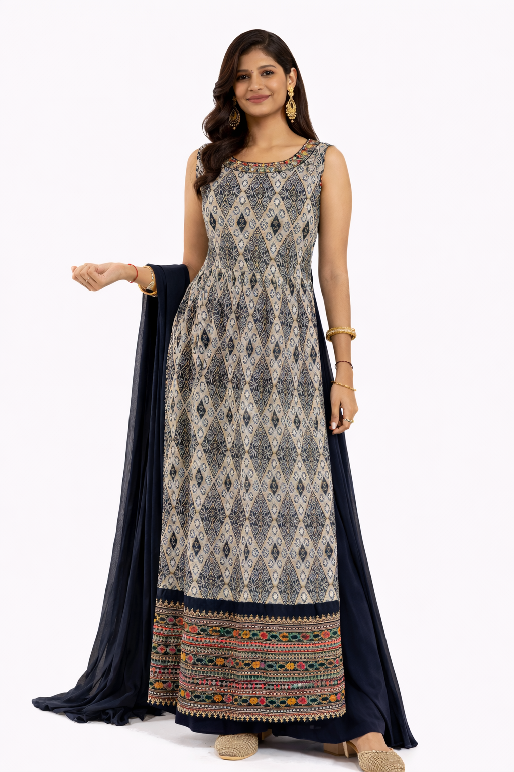 The sleeveless kurti features intricate geometric diamond prints in navy and beige tones, enhanced with delicate neckline embellishment for a refined finish. The fitted upper bodice flows beautifully into a flared Anarkali-style fall, giving the outfit movement and structure without any front slit.