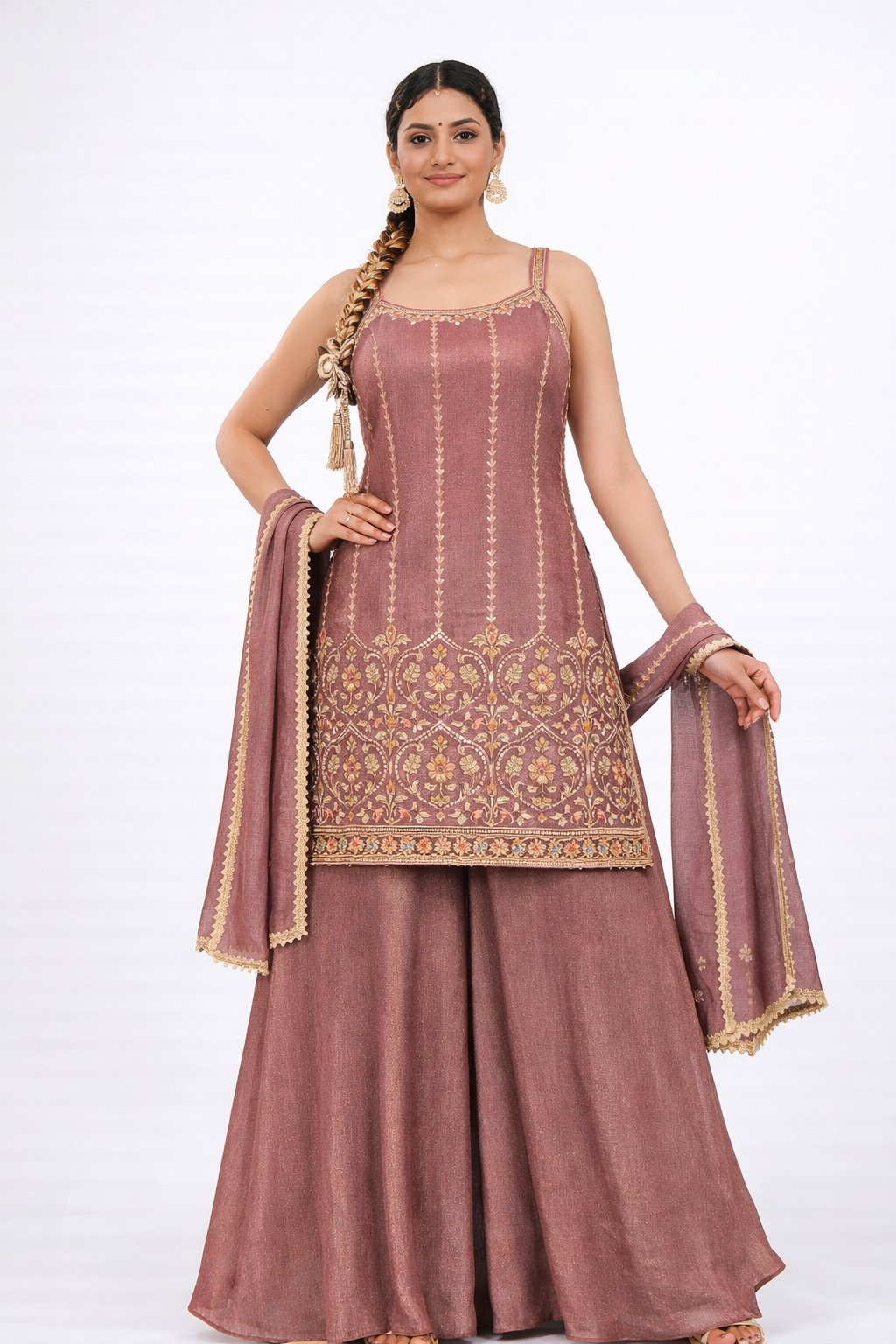 Step into understated elegance with this beautifully crafted Flare Plazo Suit, designed for graceful festive and occasion wear. The sleeveless straight-cut kurti features delicate vertical gold embroidery that elongates the silhouette, finished with an intricately embroidered hem showcasing floral and traditional motifs.The ensemble is paired with flowy flare palazzo pants, offering effortless movement and comfort, while the matching dupatta with subtle gold detailing and finished borders completes the look with refined charm. The soft sheen of the fabric adds a luxurious touch without being overpowering, making it perfect for both daytime and evening events.Ideal for festive gatherings, weddings, mehndi functions, and special celebrations, this plazo suit blends modern elegance with traditional craftsmanship.