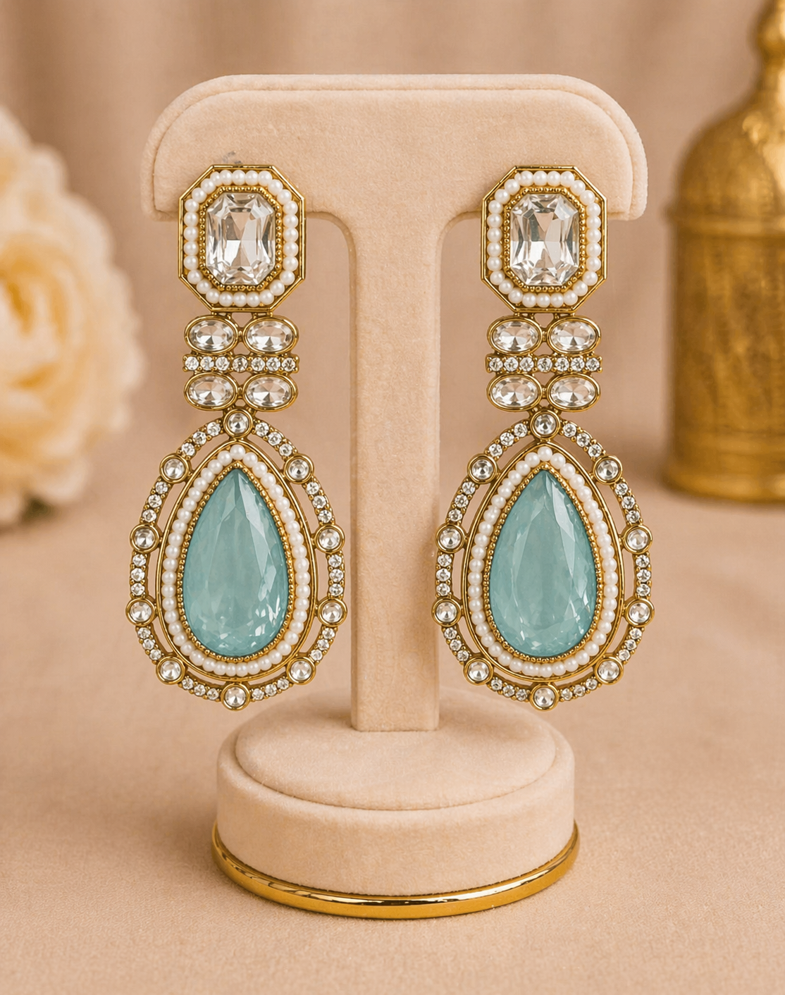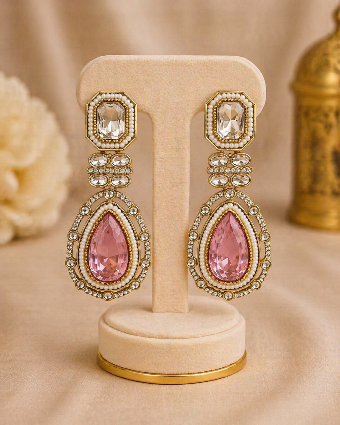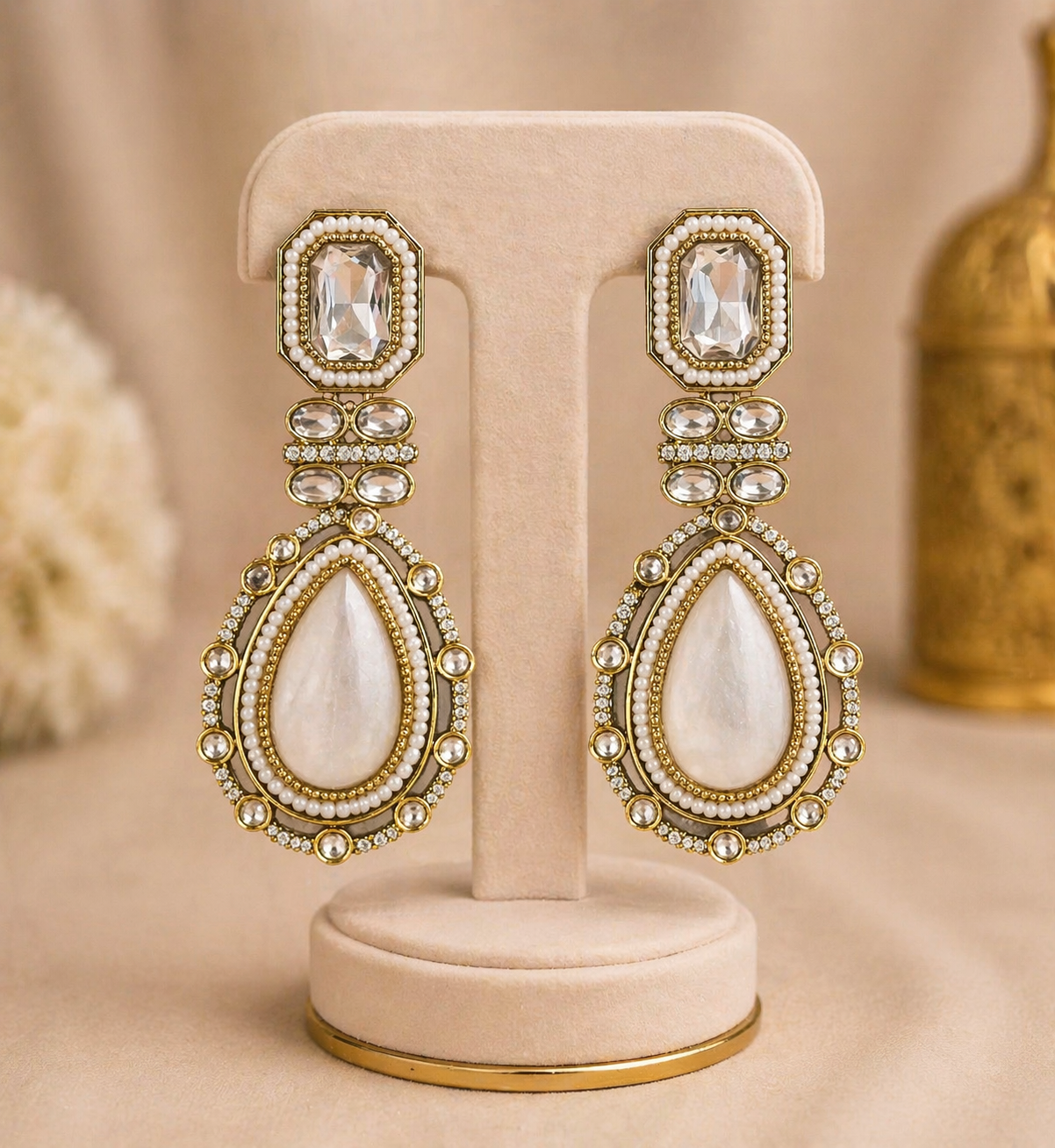 The layered design with geometric top studs and graceful drop silhouette creates a perfect balance of tradition and modern luxury. Ideal for festive occasions, weddings, or evening wear, these earrings effortlessly elevate any outfit.