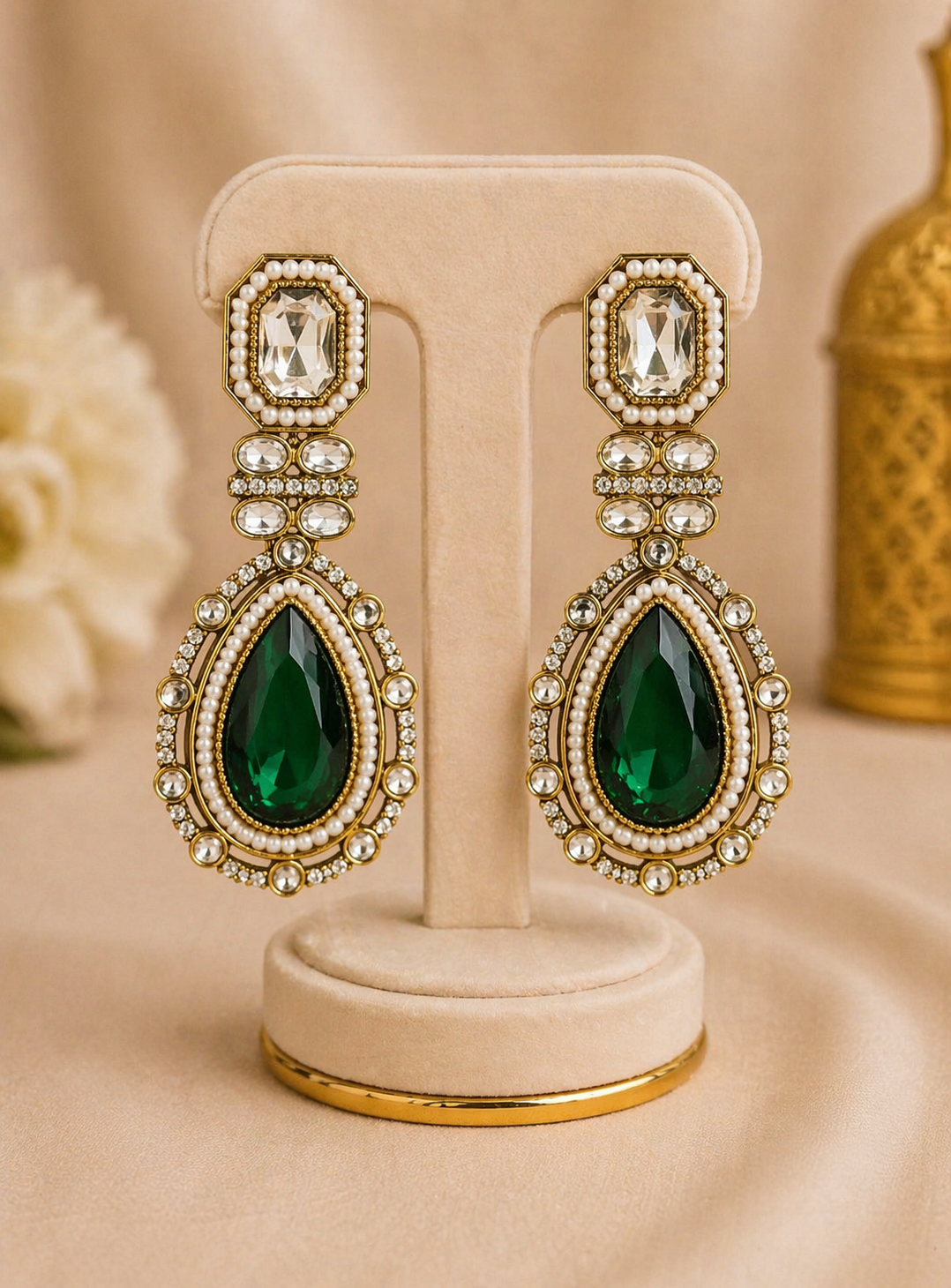 Elegant Earrings Add a touch of refined elegance to your look with these beautifully crafted statement earrings. Designed with a rich gold-tone finish, this piece features a stunning pista green teardrop stone at the center, surrounded by delicate pearl detailing and sparkling crystal accents.