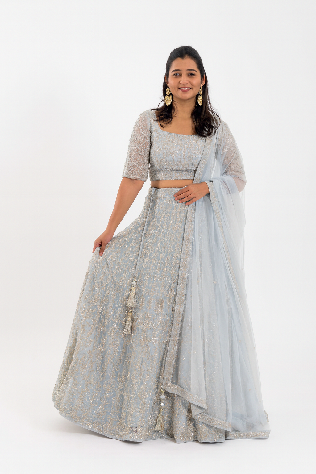 The ensemble consists of three main components: the lehenga, the blouse, and the dupatta. The lehenga is a voluminous skirt that is typically heavily embellished with stone works. The stones used can be a variety of types, such as crystals, rhinestones, or gemstones, creating a dazzling and luxurious effect. The blouse is a fitted garment that complements the lehenga, and it is also adorned with stone works, adding a touch of glamour and richness to the outfit. The dupatta is a long scarf that is draped over the shoulders, and it can also feature stone works, enhancing the overall look.