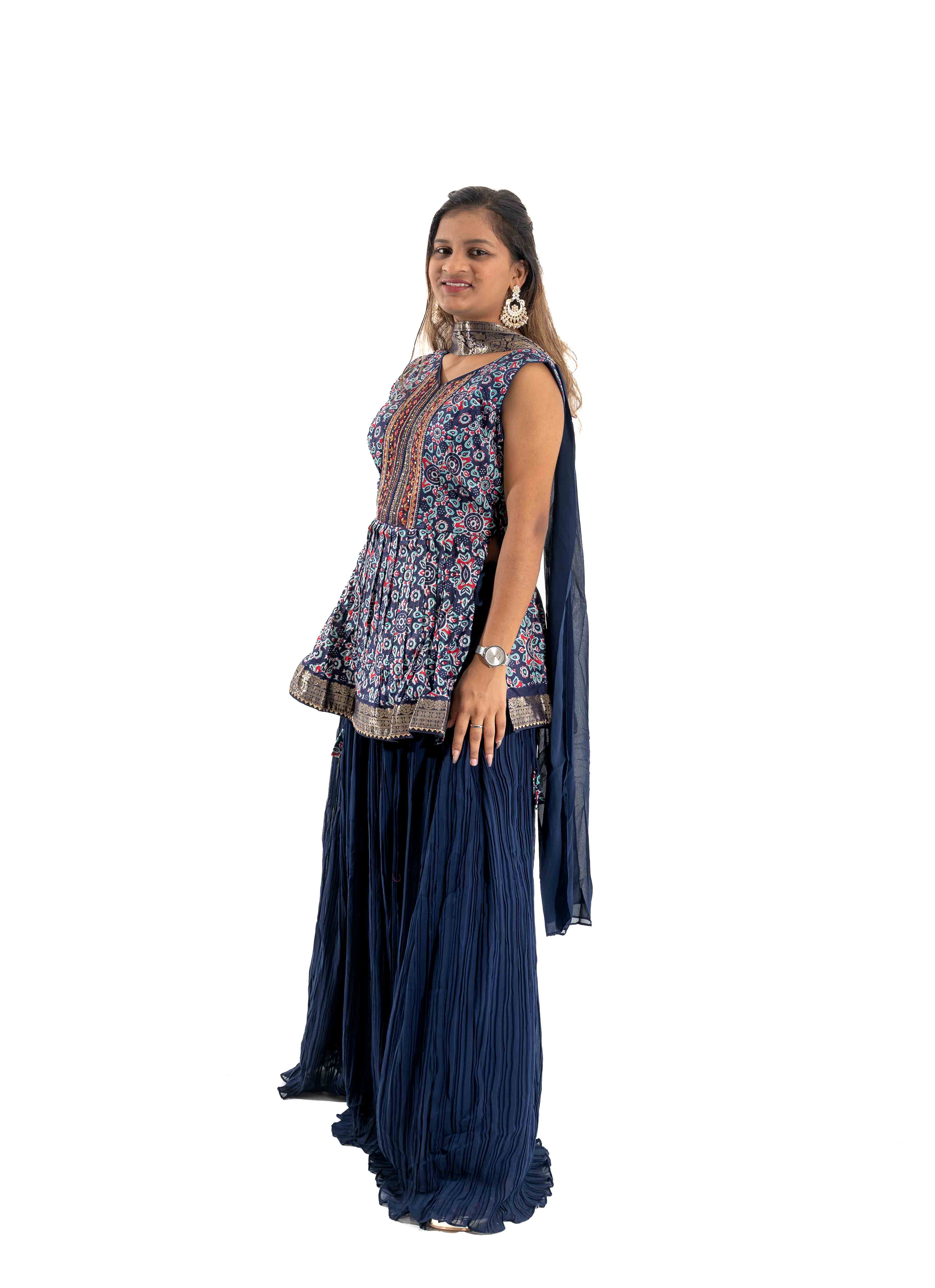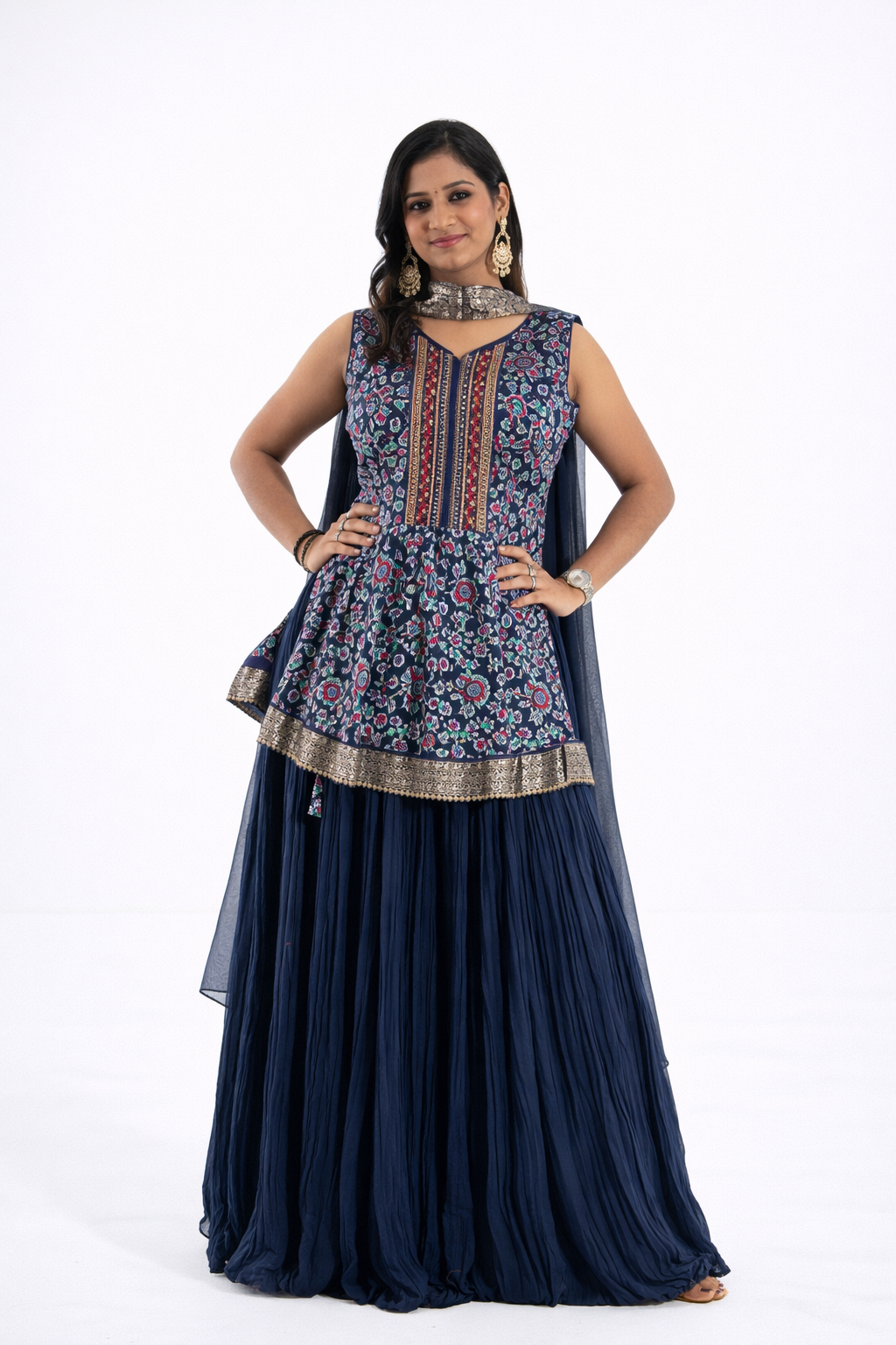 Step into effortless elegance with this stunning navy blue Lehenga ensemble, designed for women who love graceful silhouettes with a modern ethnic touch.The sleeveless printed kurti features intricate floral and geometric motifs in rich tones, highlighted with a beautifully detailed embroidered front panel that adds depth and sophistication. The flared peplum-style top enhances the waistline while creating a flattering flow.Paired with a voluminous pleated navy palazzo, the outfit offers both comfort and dramatic movement. The soft fabric drapes beautifully, making it perfect for festive occasions, family functions, or special gatherings. A matching dupatta completes the look, adding elegance and balance to the ensemble.