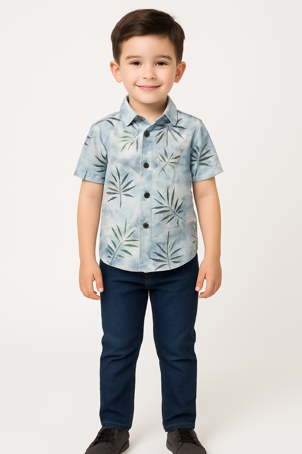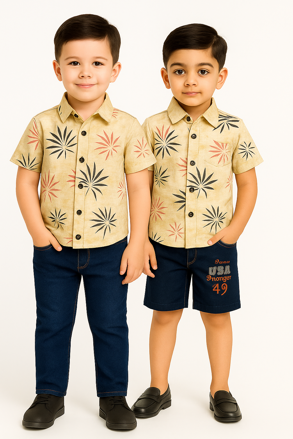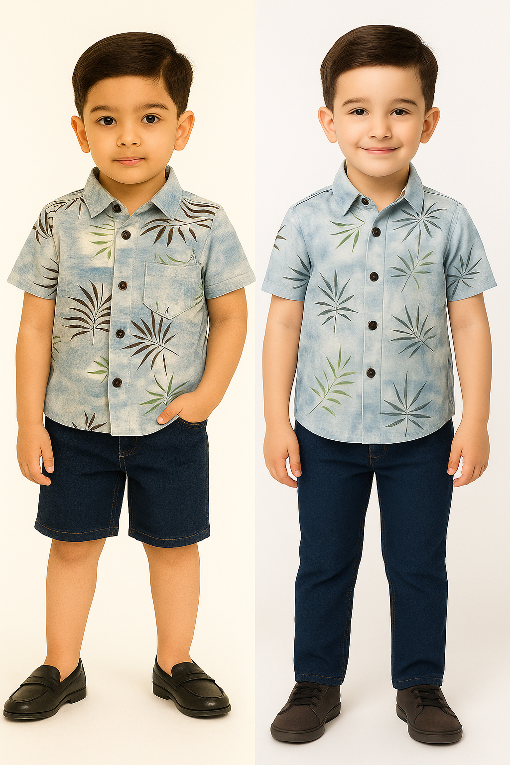 Smart and comfortable boys’ outfit featuring a soft printed collared shirt paired with blue denim — available in both long pants and shorts. Perfect for daily wear, outings and family events. Fabric is soft, breathable and easy to maintain. Sizes available from 4 to 10 years.