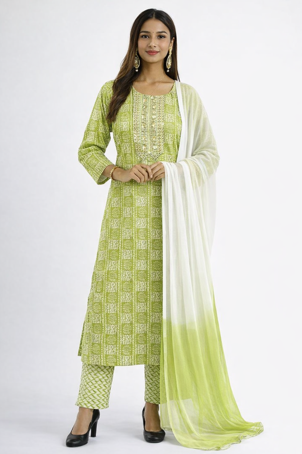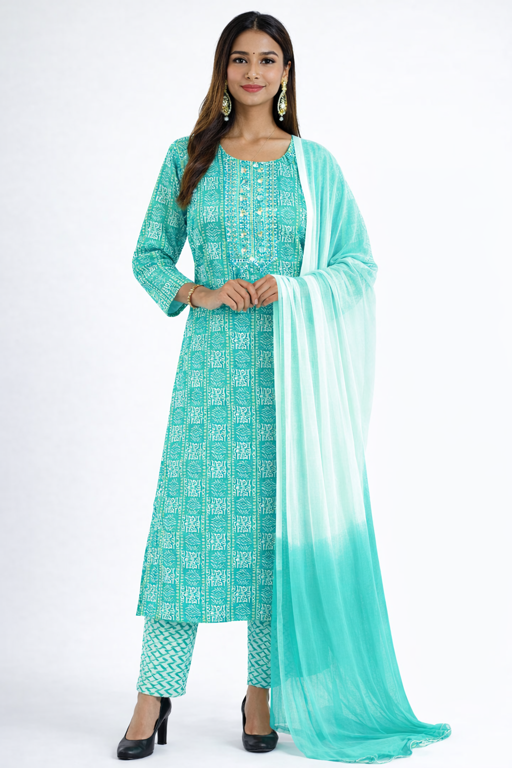 Refresh your ethnic collection with this elegant Ankle Suit Set, designed to bring effortless grace and everyday sophistication. The straight-cut kurta features delicate all-over traditional prints with subtle embroidery detailing along the neckline, giving it a refined yet understated look. The three-quarter sleeves add comfort and versatility, making it ideal for both casual and festive wear.