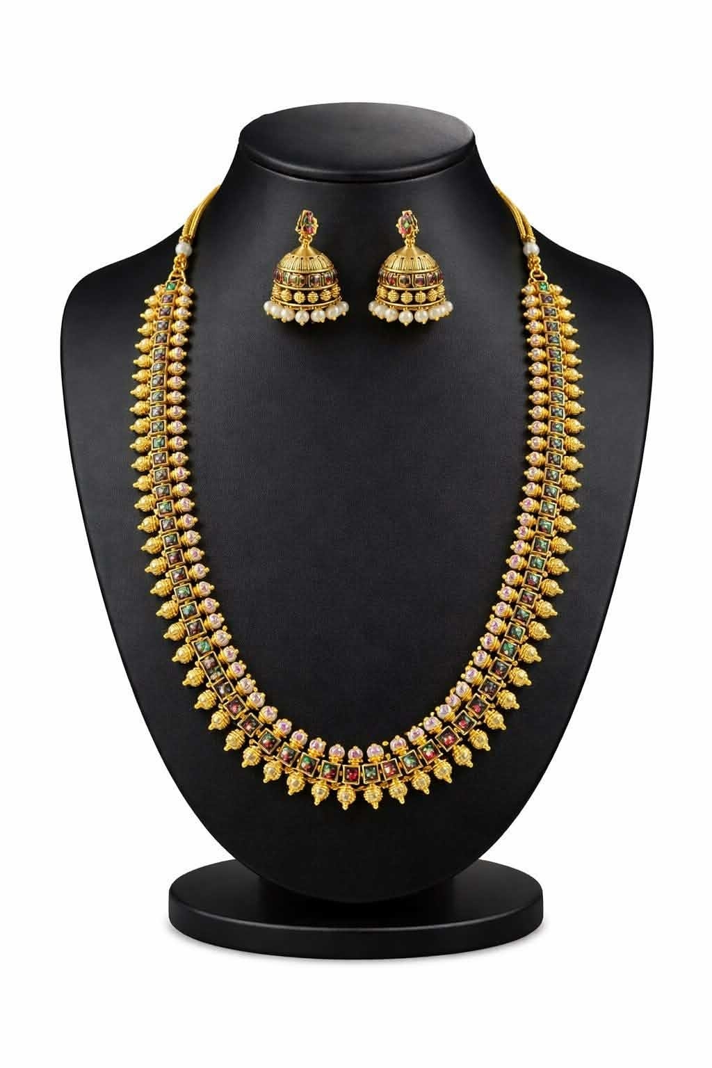 Add a touch of heritage elegance to your ethnic look with this exquisite temple-style necklace set, crafted to reflect traditional South Indian artistry. The necklace features a structured gold-tone base adorned with square-cut multicolor stones, intricate detailing, and graceful gold bead accents that create a rich, regal appearance.Finished with matching traditional jhumka earrings highlighted by fine detailing and pearl drops, this set beautifully balances grandeur and wearability. Its medium-long length makes it versatile for pairing with sarees, silk lehengas, and festive ethnic outfits.Perfect for weddings, religious functions, festive celebrations, and cultural occasions.