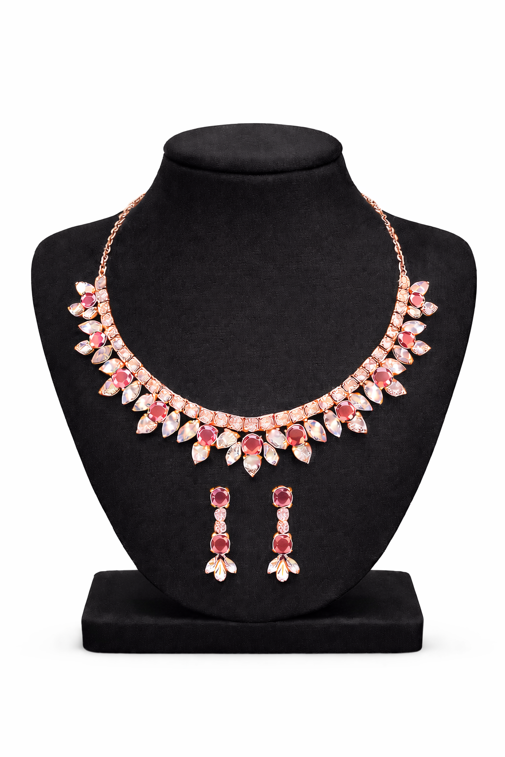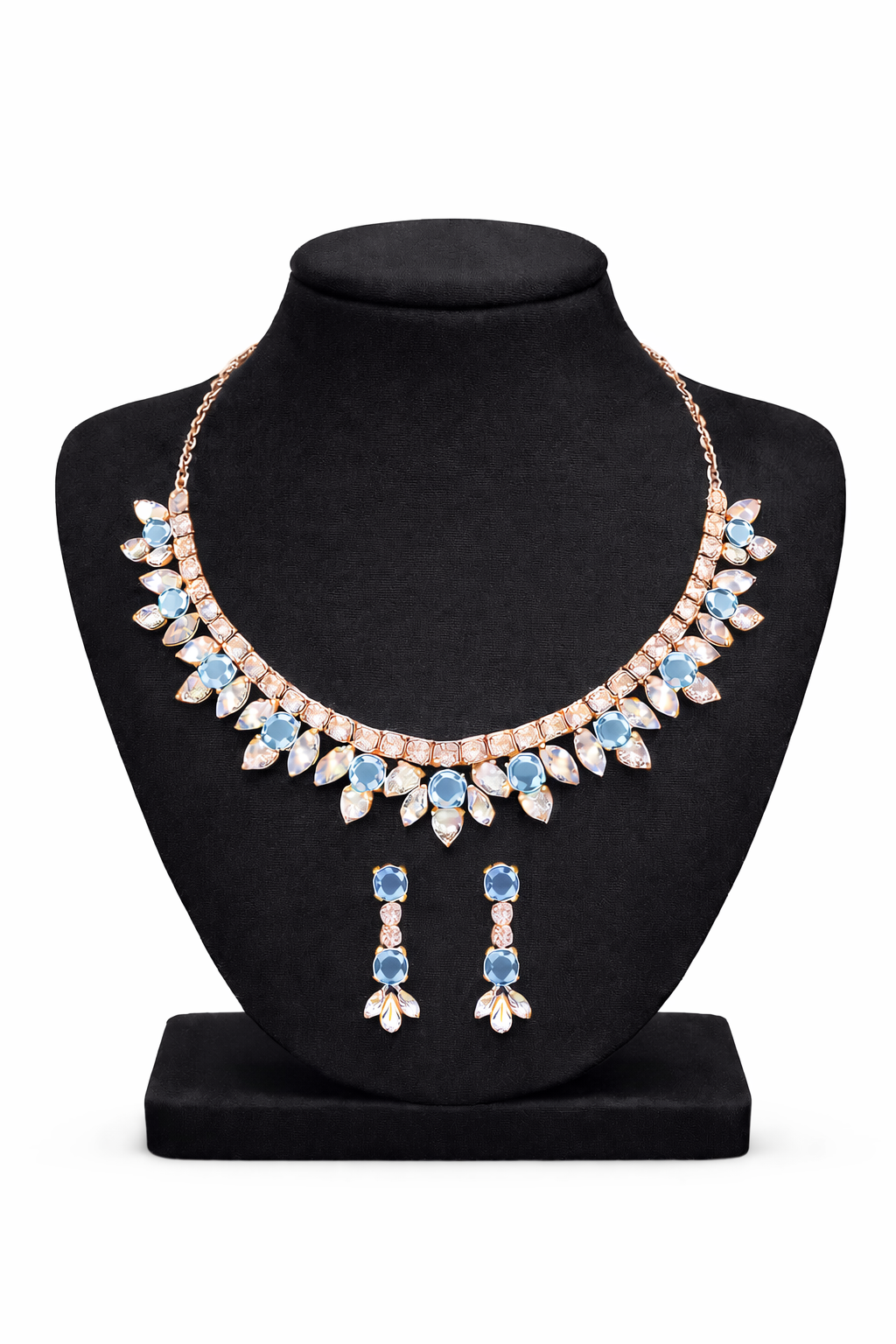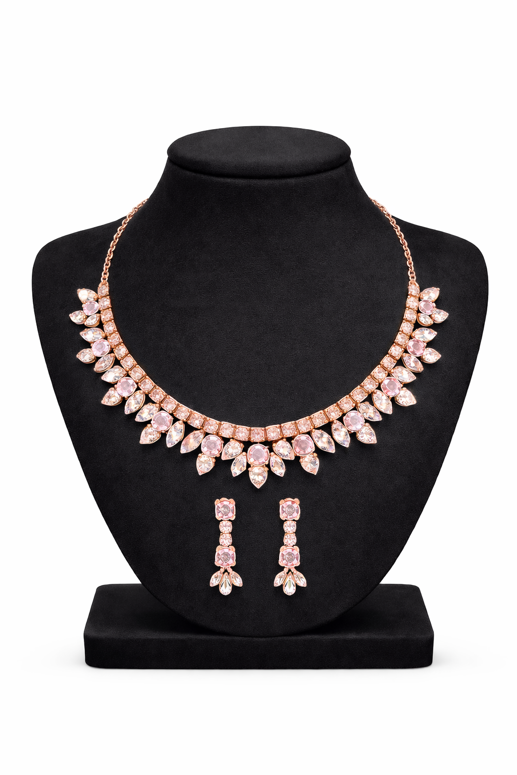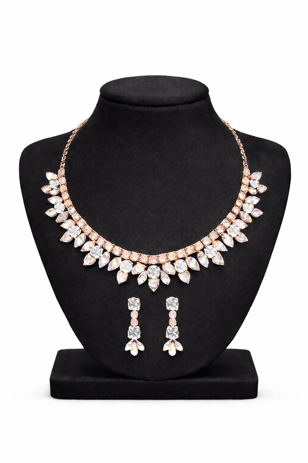This elegant necklace set features a beautifully crafted floral design adorned with shimmering white stones. The necklace is gracefully arranged with oval and marquise-cut stones, creating a refined sparkle that sits perfectly on the neckline. Paired with matching drop earrings, this set offers a timeless and sophisticated look.